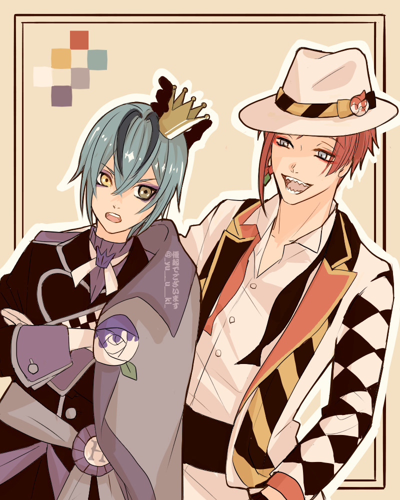 2boys black_coat blue_hair cape coat color_switch commentary_request cowboy_shot crossed_arms crown floyd_leech green_eyes grey_eyes hat heterochromia jacket looking_at_viewer male_focus mini_crown multiple_boys red_hair riddle_rosehearts sharp_teeth short_hair side_cape teeth twisted_wonderland white_jacket yellow_background yellow_eyes yuuki_(yukko7474)