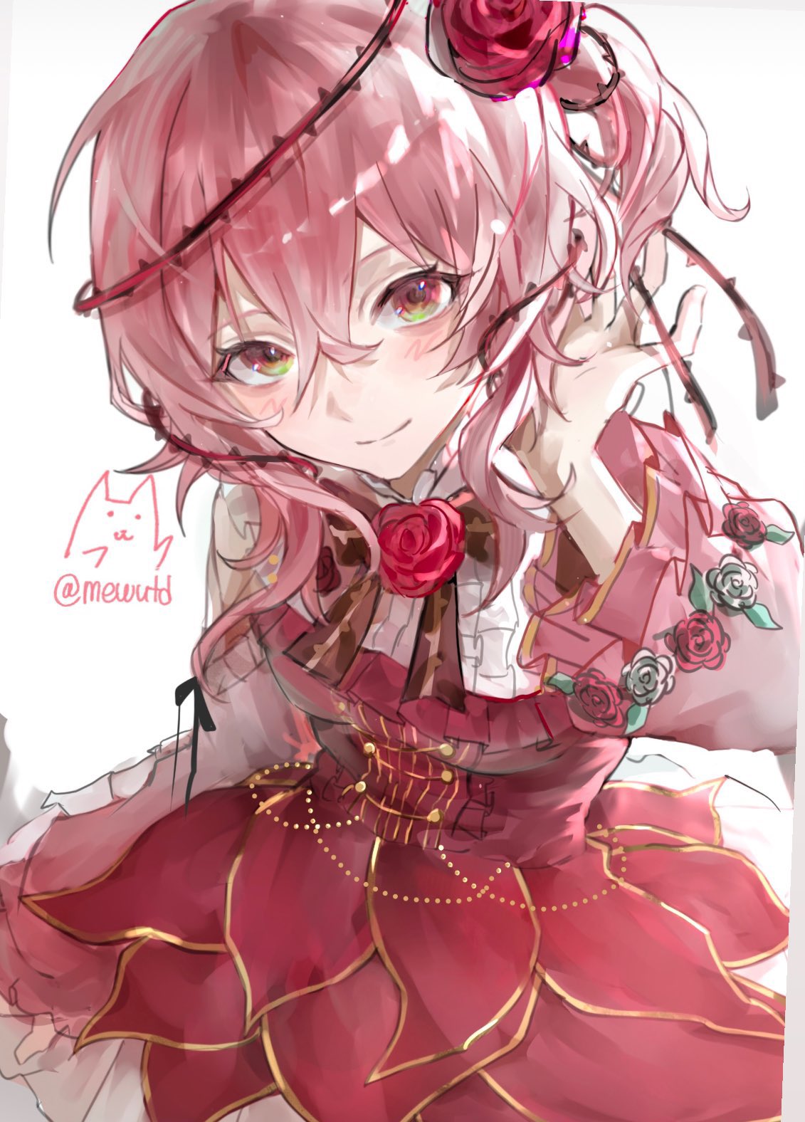 1girl blush breasts flower hair_between_eyes hair_flower hair_ornament hair_vines hand_in_own_hair highres looking_at_viewer mewutd nijisanji nijisanji_en pink_hair red_eyes red_flower red_rose rose rosemi_lovelock rosemi_lovelock_(1st_costume) side_ponytail small_breasts smile solo thorns twitter_username virtual_youtuber white_background