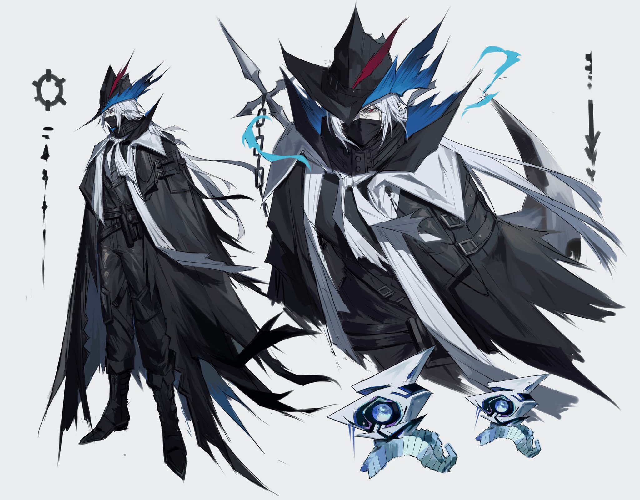 1boy anchor arknights black_boots black_cape black_pants black_shirt boots cape exocellular_depositor_(arknights) hat highres male_focus mask mouth_mask multiple_views pants potettoe scarf seaborn_(arknights) serious shirt short_hair_with_long_locks ulpianus_(arknights) white_background white_hair white_scarf