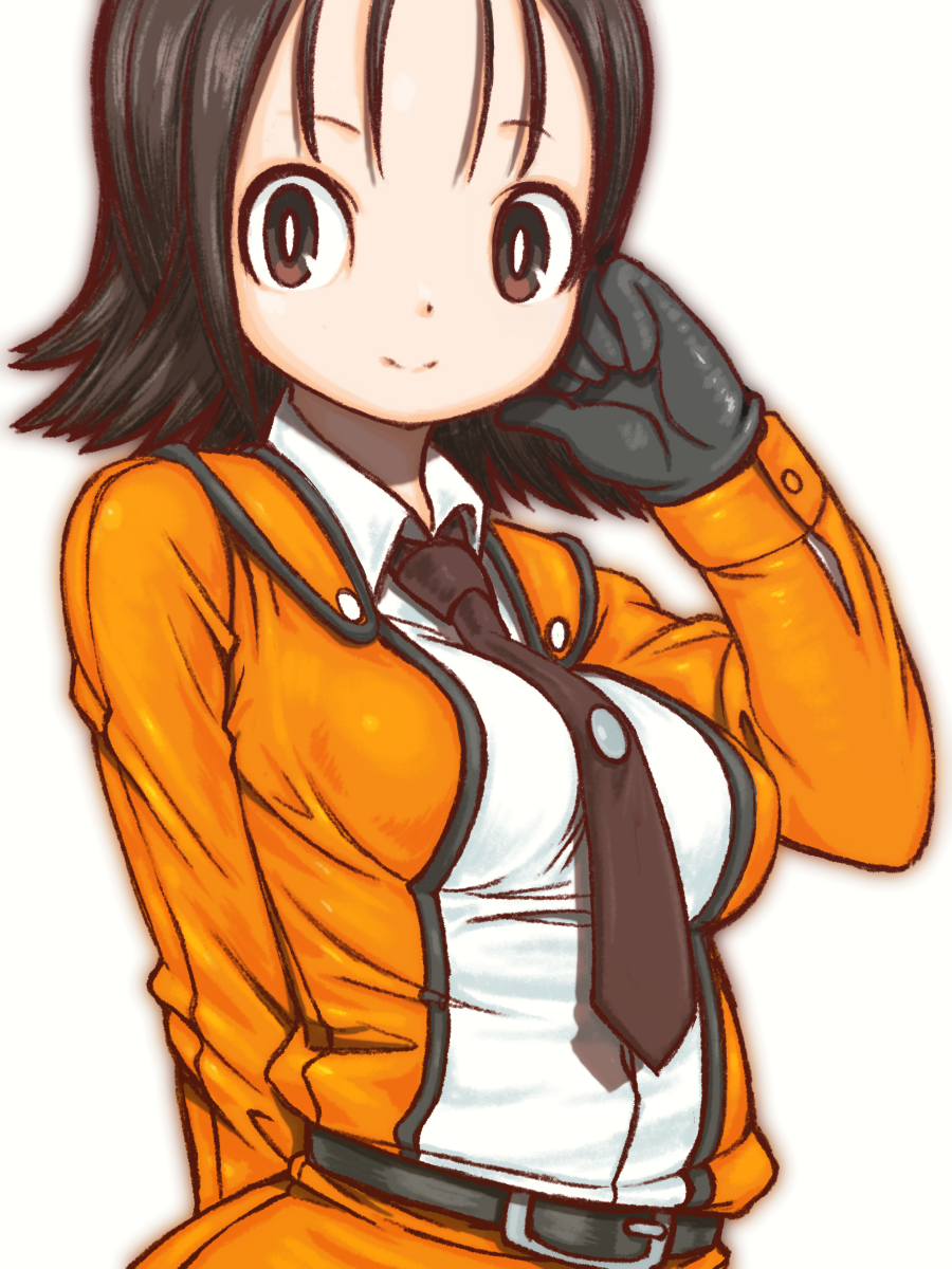 1girl arm_behind_back beeru_(veil8801) belt belt_buckle black_belt black_eyes black_gloves black_hair breasts bright_pupils brown_necktie buckle closed_mouth fuji_akiko gloves hand_up highres long_sleeves medium_breasts necktie science_special_search_party_uniform short_hair simple_background smile solo ultra_series ultraman_(1st_series) white_background white_pupils