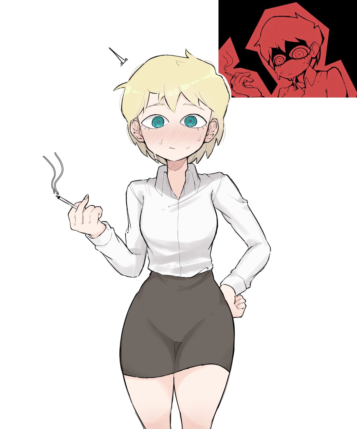1girl aqua_eyes black_skirt blonde_hair blush breasts c'venash_vishneri cigarette cowboy_shot hand_on_own_hip highres holding holding_cigarette medium_breasts miniskirt office_lady pencil_skirt psychopomp_(game) reference_inset shirt skirt smoke solo sweat taut_clothes taut_shirt white_shirt zlix0n