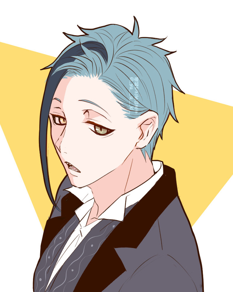 1boy black_jacket blue_hair floyd_leech green_eyes heterochromia jacket looking_at_viewer male_focus short_hair solo twisted_wonderland upper_body yellow_background yellow_eyes yuuki_(yukko7474)