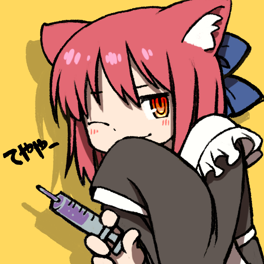 1girl ;) animal_ear_fluff animal_ears apron beeru_(veil8801) blue_bow bow cat_ears closed_mouth drop_shadow hair_bow holding holding_syringe kohaku_(tsukihime) long_sleeves one_eye_closed orange_eyes pink_hair ringed_eyes short_hair simple_background smile solo syringe tsukihime white_apron yellow_background