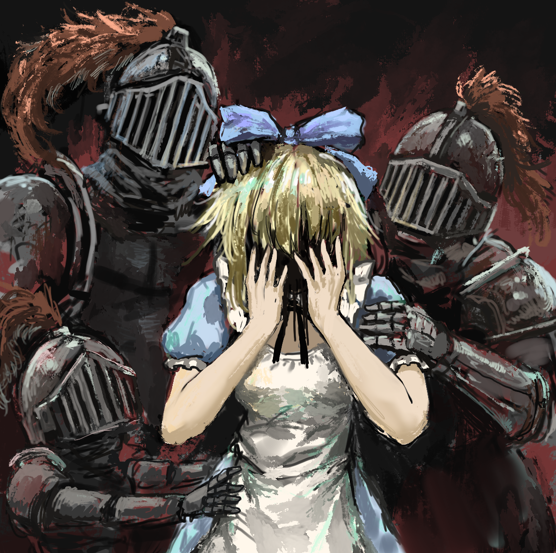 1girl 3boys alice_(black_souls) apron armor black_liquid black_souls black_souls_2 blonde_hair blue_dress blue_ribbon covering_face dress frills full_armor gauntlets grimm_(black_souls) hair_ribbon hand_on_another's_head hand_on_another's_hip hand_on_another's_shoulder hands_on_own_face helmet hole_in_face multiple_boys puffy_short_sleeves puffy_sleeves ribbon role_reversal short_sleeves white_apron zhuxie1264852