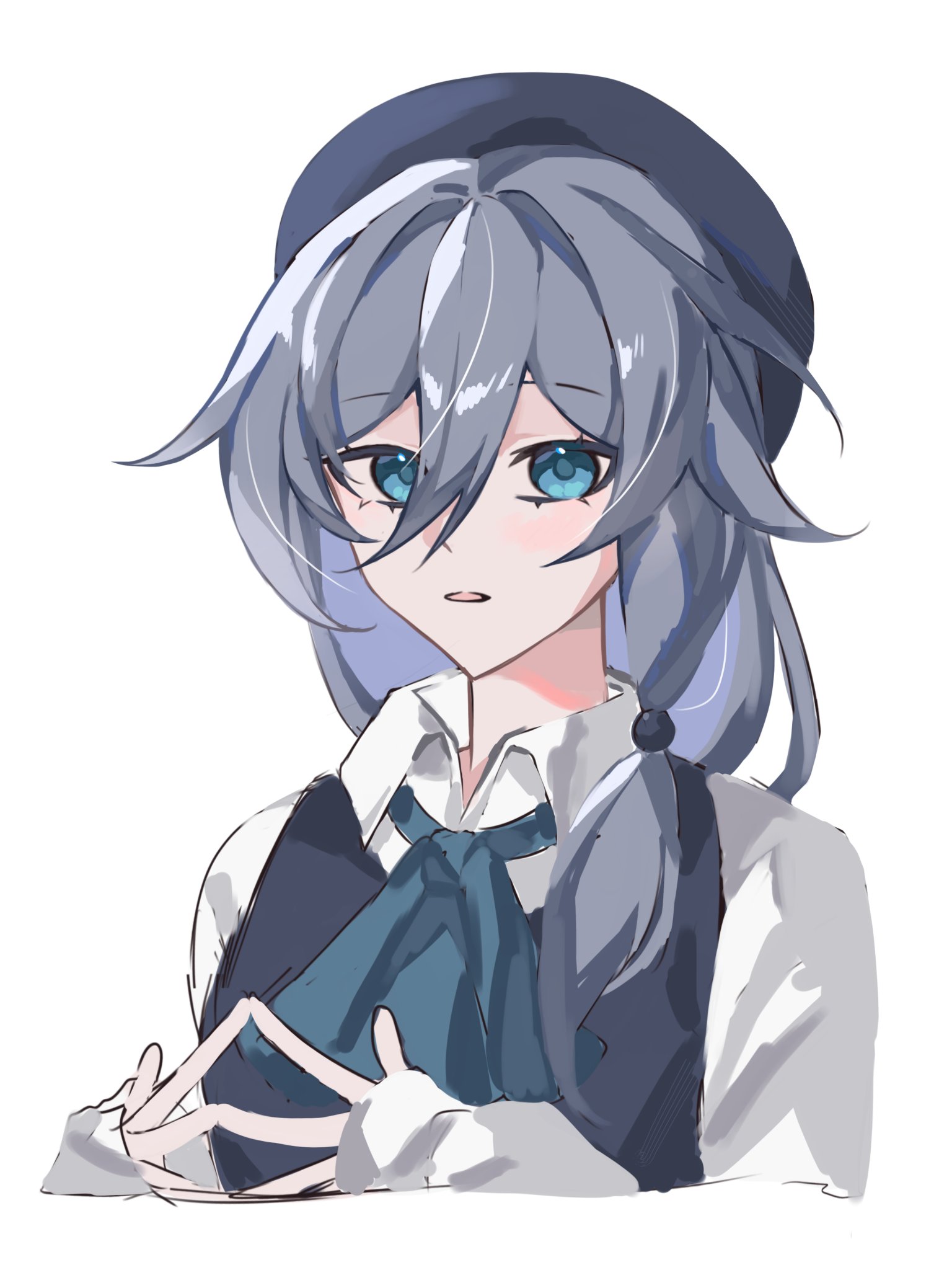 1girl ascot black_hat black_vest blue_eyes collared_shirt commentary cropped_torso fu_hua green_ascot grey_hair hair_between_eyes hat highres honkai_(series) honkai_impact_3rd looking_at_viewer mmaayyooccaatt parted_lips shirt simple_background solo steepled_fingers vest white_background white_shirt