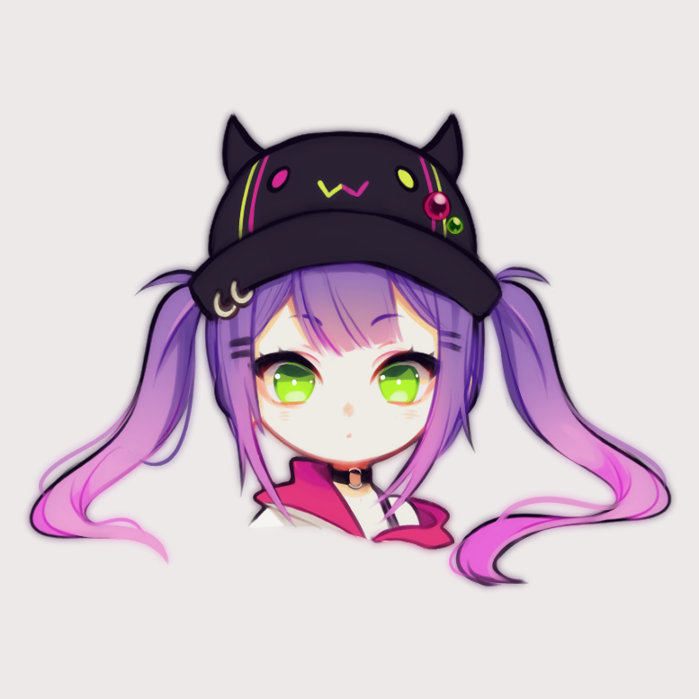 1girl :3 bibi_(tokoyami_towa) black_hat choker commentary commission fake_horns gradient_hair green_eyes hat hololive horned_headwear horns multicolored_hair o-ring o-ring_choker pink_hair portrait purple_hair shachi_(shachimu) solo tokoyami_towa twintails virtual_youtuber