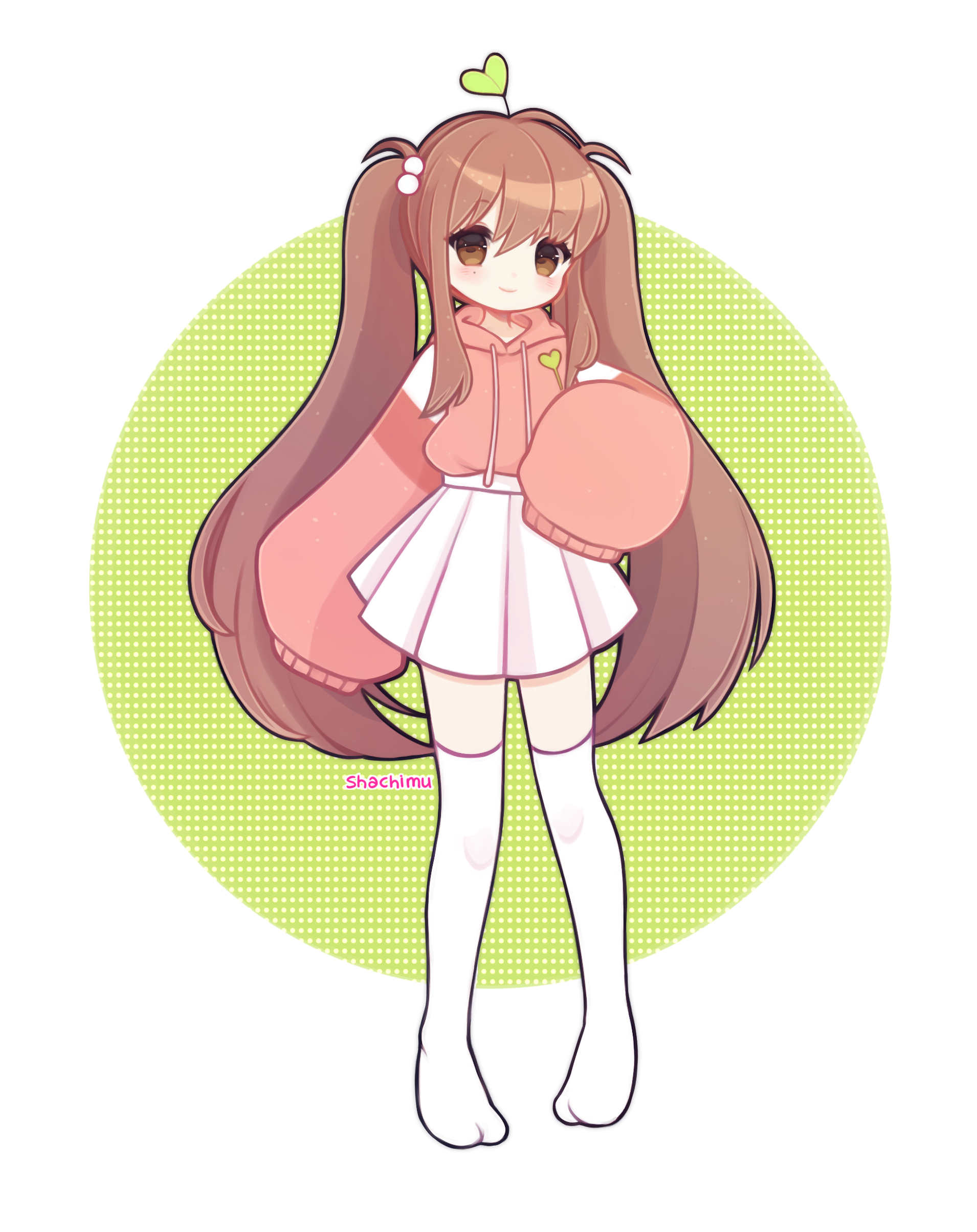 1girl absurdres art_trade artist_name brown_eyes brown_hair clover commentary english_commentary full_body high-waist_skirt highres holding hood hooded_sweater hoodie long_hair miniskirt original pink_hoodie pink_sweater pleated_skirt shachi_(shachimu) skirt sleeves_past_fingers sleeves_past_wrists solo sweater thighhighs third-party_source very_long_hair white_thighhighs