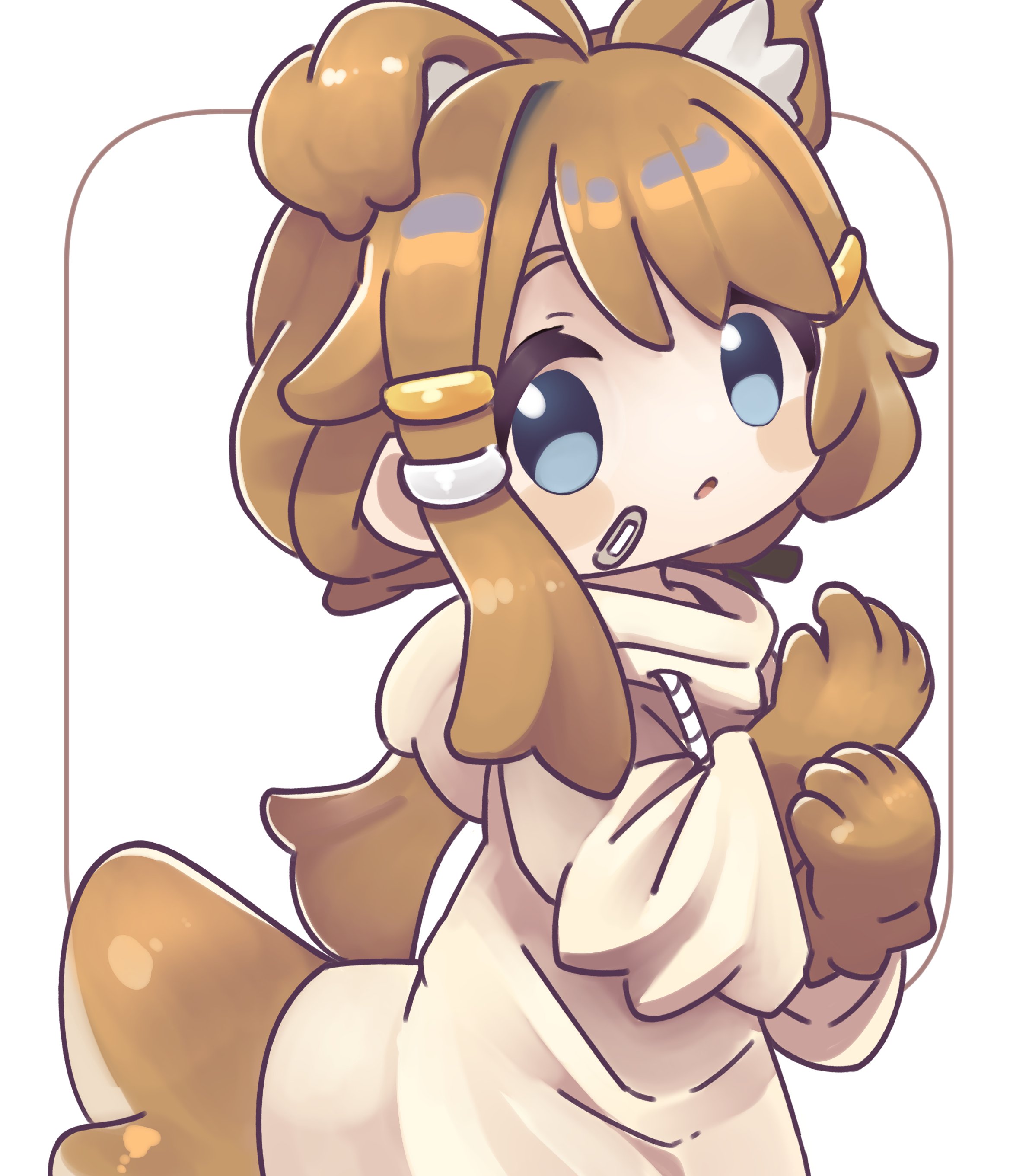 1girl :o absurdres ahoge animal_ear_fluff animal_ears animal_hands bandaid bandaid_on_cheek bandaid_on_face blue_eyes blush blush_stickers borrowed_character brown_dress brown_gloves brown_hair brown_hoodie chibi dog_ears dog_girl dog_tail drawstring dress extra_ears gloves hair_between_eyes hair_ornament hairclip hands_up highres hood hood_down hoodie long_hair long_sleeves looking_at_viewer low_ponytail mamehinata parted_lips paw_gloves ponytail short_eyebrows simple_background solo tail thick_eyebrows trim5654 upper_body very_long_hair vrchat white_background wide_sleeves
