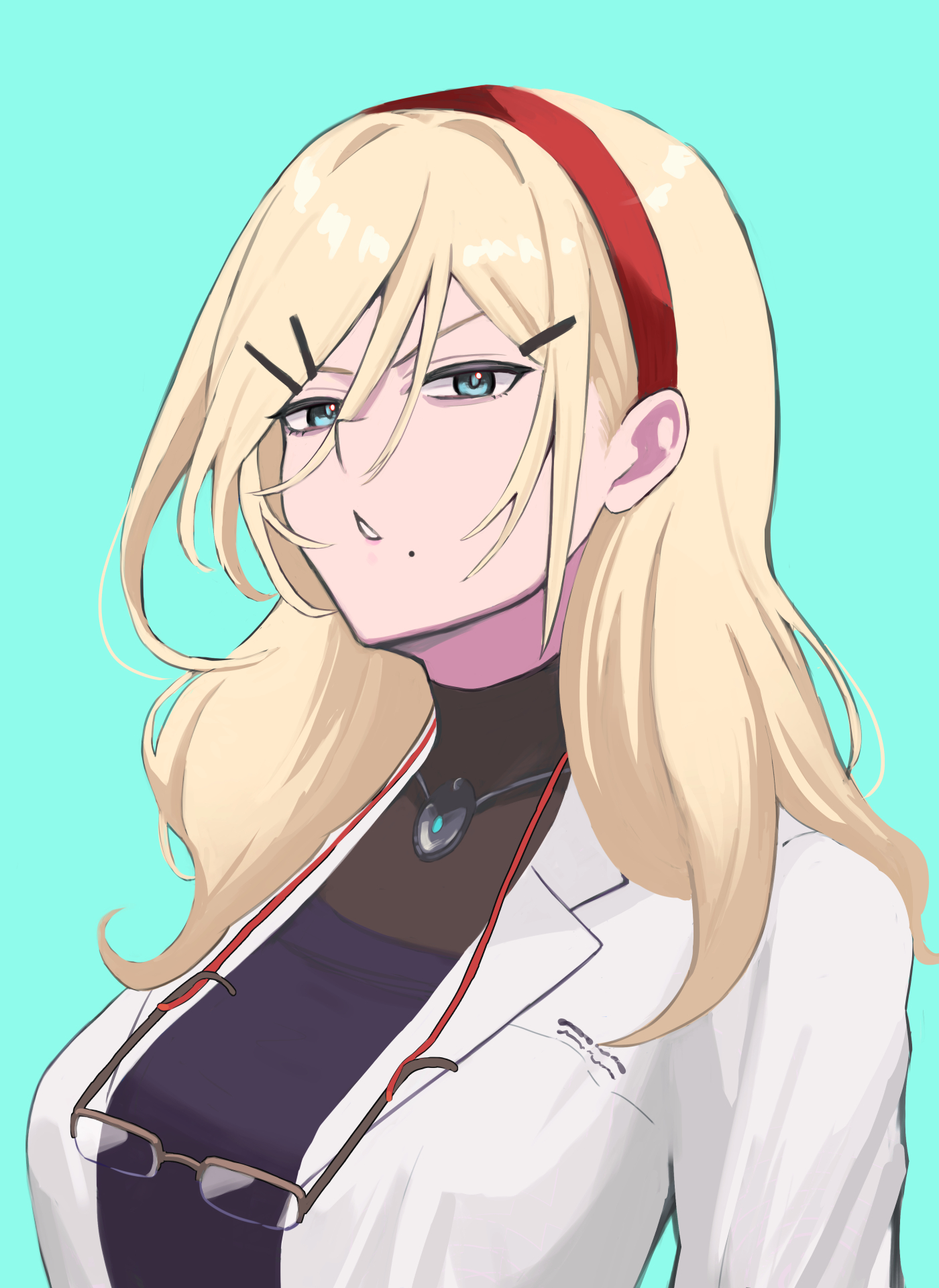 1girl aqua_background aqua_eyes black_bodysuit blonde_hair bodysuit breasts coat commentary english_commentary girls'_frontline hair_between_eyes hair_ornament hairband hairpin highres lab_coat long_hair long_sleeves looking_at_viewer mole mole_under_mouth open_mouth parted_lips red_hairband shaw_(girls'_frontline) solo unworn_eyewear upper_body white_coat yotsuyama_(yomo8ama)