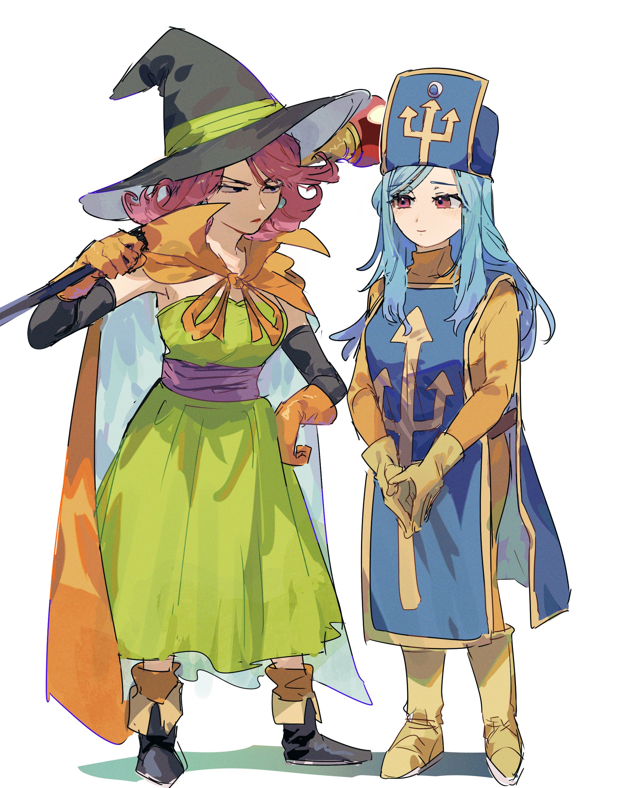 2girls absurdres black_boots black_hat black_sleeves blue_hair blue_hat blue_tabard bodysuit boots breasts cape closed_mouth commentary_request detached_sleeves dragon_quest dragon_quest_iii dress earrings full_body gloves green_dress hand_on_own_hip hat highres holding holding_staff jewelry long_hair looking_at_another mage_(dq3) mage_staff medium_breasts medium_hair mogana_zo multiple_girls orange_bodysuit orange_cape orange_gloves pink_hair popped_collar priest_(dq3) purple_sash red_eyes red_lips sash staff standing tabard two-sided_cape two-sided_fabric white_background witch_hat yellow_boots yellow_gloves