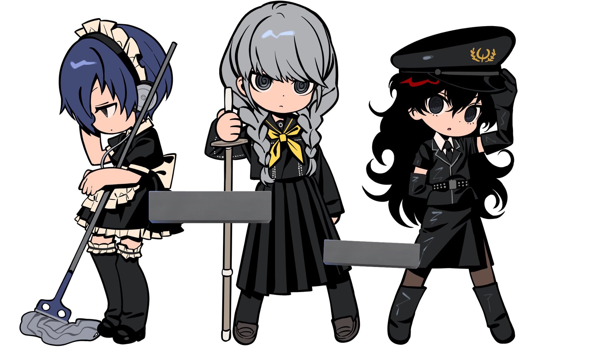 adjusting_clothes adjusting_headwear amamiya_ren belt betti_(xx_betti) black_hair blue_hair boots genderswap grey_eyes grey_hair headphones highres holding holding_mop long_hair looking_at_viewer maid maid_headdress mop narukami_yu persona persona_3 persona_4 persona_5 school_uniform yasogami_school_uniform yuuki_makoto_(persona_3)