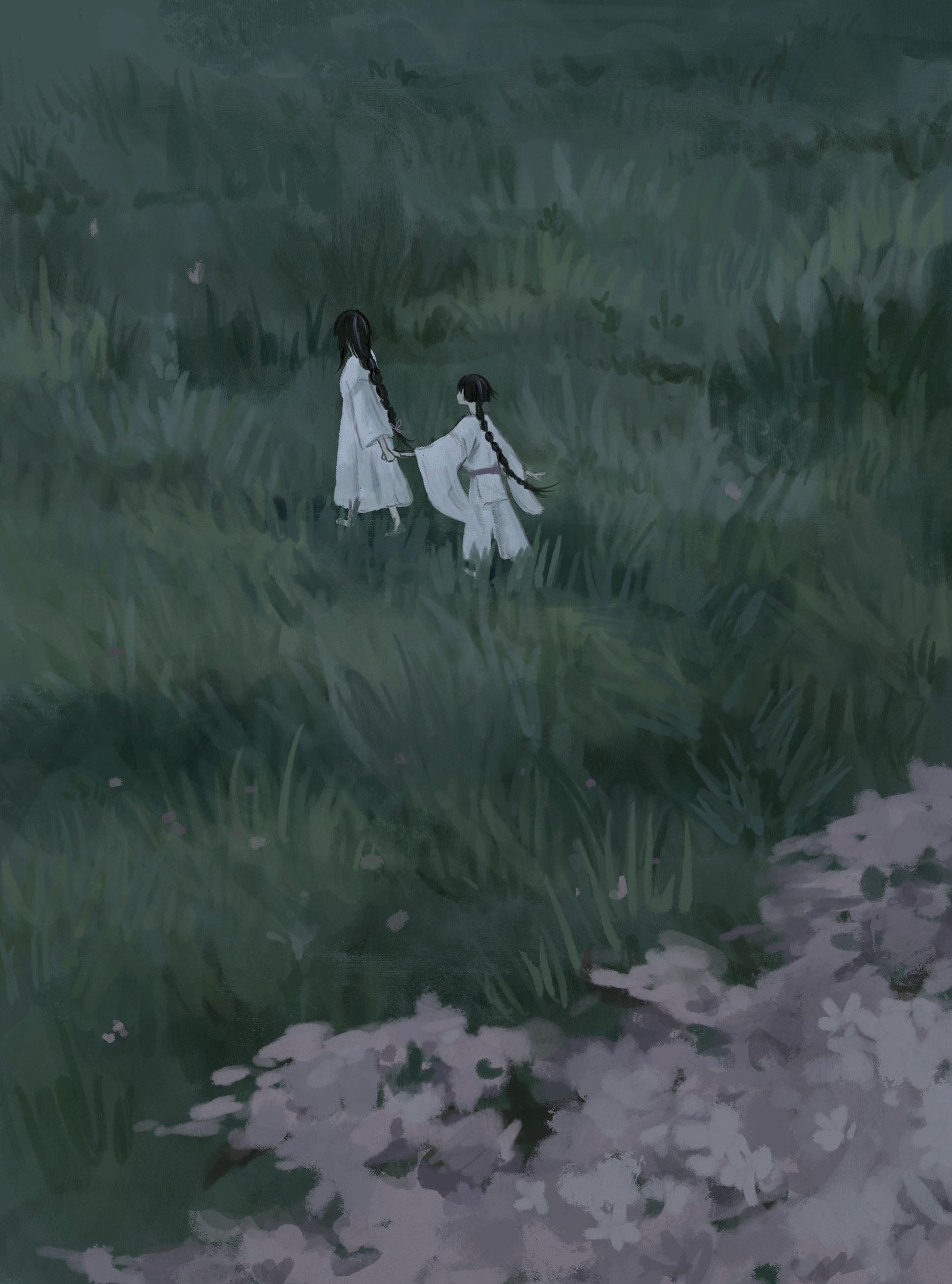 1boy 1girl alternate_hair_length alternate_hairstyle arm_at_side black_hair blunt_ends braid cherry_blossoms dress facing_another from_behind genshin_impact grass highres holding_hands japanese_clothes kariginu long_hair long_sleeves low-braided_long_hair low-tied_long_hair mother_and_son multicolored_hair outstretched_arm painterly pants pelvic_curtain purple_sash raiden_shogun sash scaramouche_(genshin_impact) scaramouche_(kabukimono)_(genshin_impact) sidelocks streaked_hair walking white_dress white_pants wide_sleeves yoruli_e