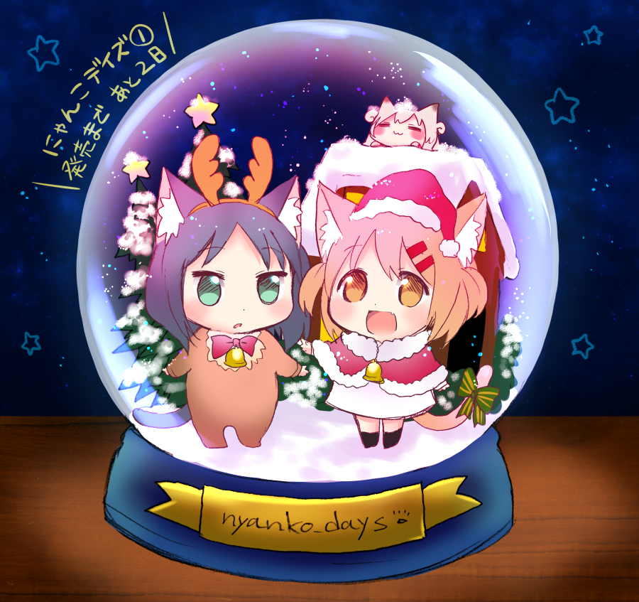 3girls :3 animal_costume animal_ears brown_eyes cat_ears cat_girl cat_tail christmas copyright_name fang full_body green_eyes hat in_snow_globe maa_(nyanko_days) multiple_girls nyanko_days open_mouth reindeer_costume rou_(nyanko_days) santa_hat shii_(nyanko_days) shirt skin_fang snow_globe star_(symbol) tail tarabagani translation_request white_shirt