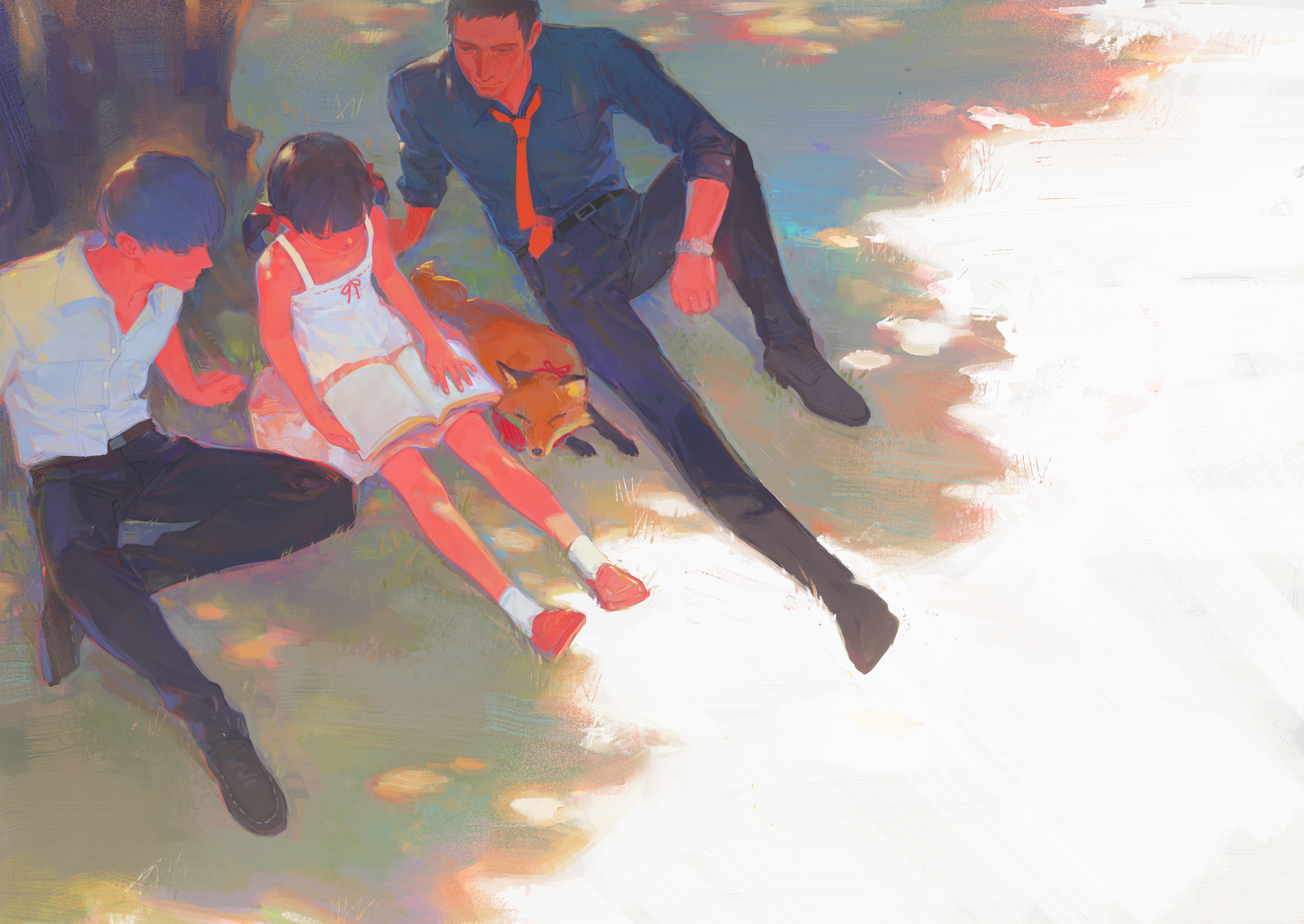 1girl 2boys absurdres black_hair black_pants black_shoes book brown_hair creamyghost doujima_nanako doujima_ryoutarou dress family father_and_child father_and_daughter fox highres kitsune_(persona_4) looking_at_another multiple_boys narukami_yu necktie open_book pants parent_and_child persona persona_4 reading red_necktie shirt shoes sitting socks tree under_tree white_dress white_shirt white_socks