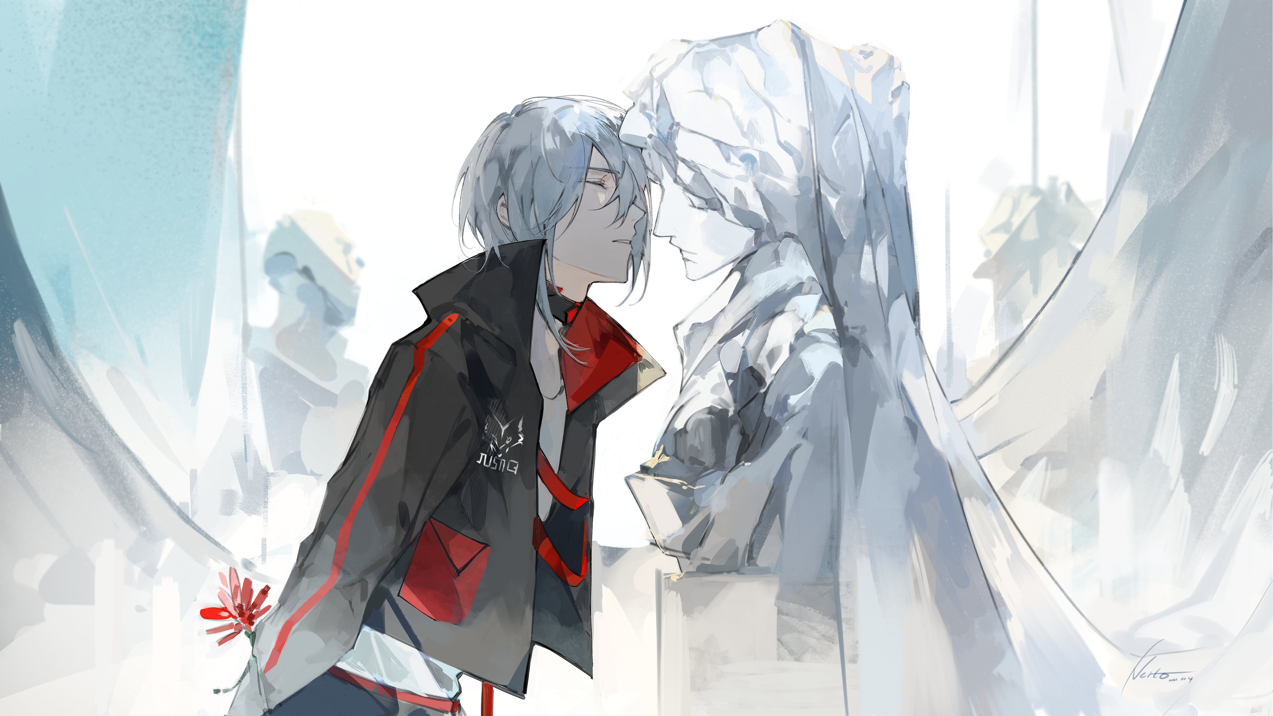 1boy absurdres arm_behind_back bust_(sculpture) closed_eyes closed_mouth collared_jacket commentary crew_neck flower from_side fulgur_ovid fulgur_ovid_(1st_costume) grey_hair hashtag-only_commentary highres jacket leaning leaning_forward male_focus nijisanji nijisanji_en open_clothes open_jacket parted_bangs parted_lips popped_collar red_flower sculpture shirt virtual_youtuber white_shirt yingqian1010