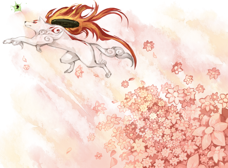 amaterasu_(ookami) animal animal_focus body_fur fire flower midair minahamu no_humans ookami_(game) pink_flower plant solo white_fur white_tail white_wolf wolf