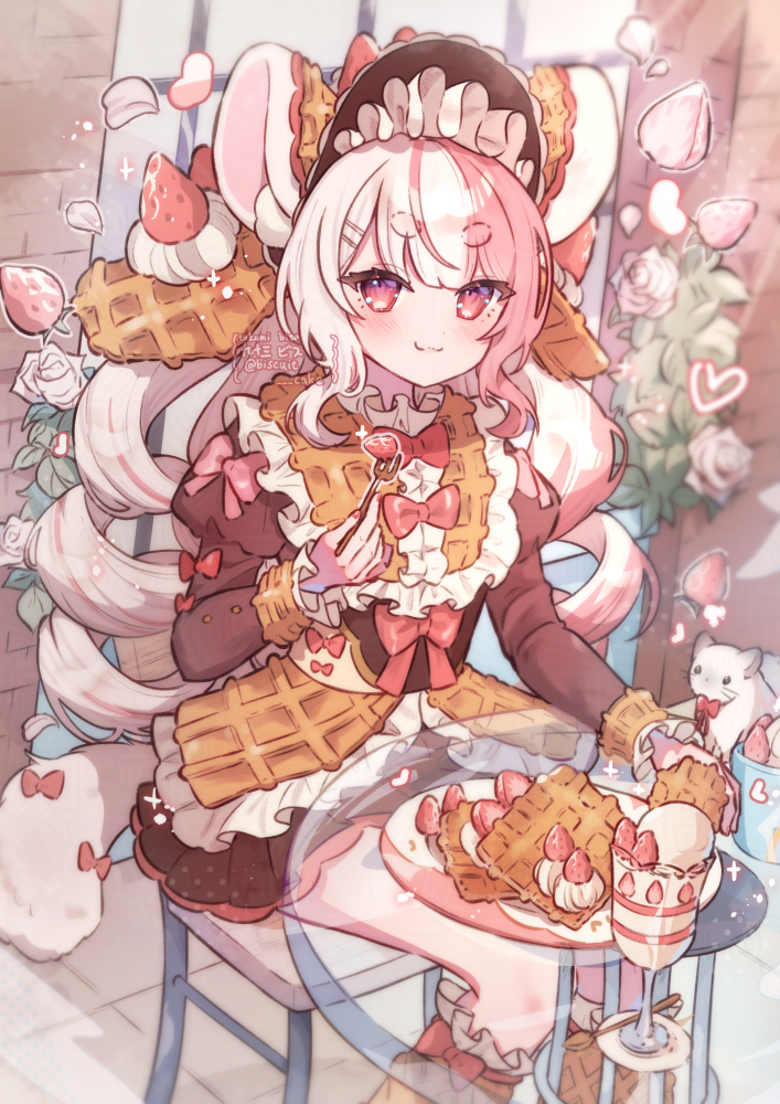 1girl animal_ears artist_name blush brown_dress brown_hat brown_socks chair closed_mouth commentary cup dress drinking_glass feet_out_of_frame food fork frilled_dress frilled_socks frills fruit glass_table hair_ornament hairclip hand_up hat holding holding_fork juliet_sleeves kneehighs long_hair long_sleeves looking_at_viewer mouse_(animal) mouse_ears mouse_girl mouse_tail on_chair original pink_hair puffy_sleeves red_eyes sitting smile socks solo strawberry untranslatable_commentary table tail thick_eyebrows tsukumi_bis twintails twitter_username waffle