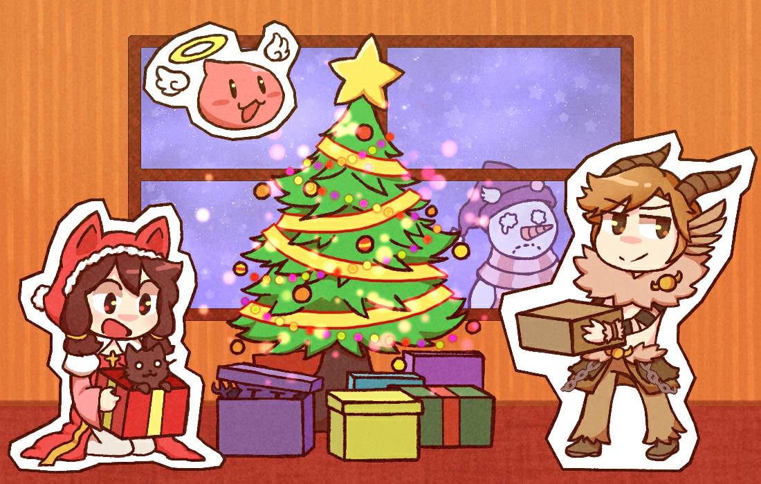 1boy 1girl angel_wings angeling arch_bishop_(ragnarok_online) black_cat blckbrd17 box brown_eyes brown_hair brown_horns brown_pants cat chain chibi chibi_only christmas christmas_tree closed_mouth commentary cross detached_wings deviruchi dress english_commentary full_body fur-trimmed_hood fur_collar fur_trim halo holding holding_box hood hood_up horns indoors juliet_sleeves long_sleeves looking_at_viewer open_mouth pants puffy_sleeves ragnarok_online red_dress red_hood shadow_chaser_(ragnarok_online) short_hair sitting slime_(creature) smile snowing snowman snowysnow_(ragnarok_online) standing star_(symbol) traditional_halo window wings