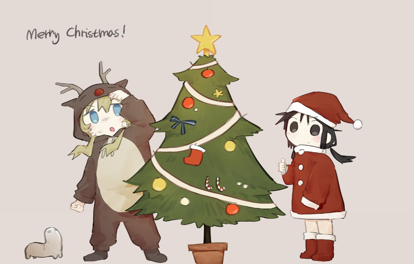 2girls animal_costume black_eyes black_hair blonde_hair blue_eyes boots chito_(shoujo_shuumatsu_ryokou) christmas christmas_tree commentary cosplay creature drawingreal2 dress full_body fur-trimmed_boots fur_trim hat kigurumi long_hair long_sleeves low_twintails merry_christmas multiple_girls nuko_(shoujo_shuumatsu_ryokou) open_mouth reindeer_costume santa_costume santa_dress santa_hat shoujo_shuumatsu_ryokou smile thumbs_up twintails yuuri_(shoujo_shuumatsu_ryokou)