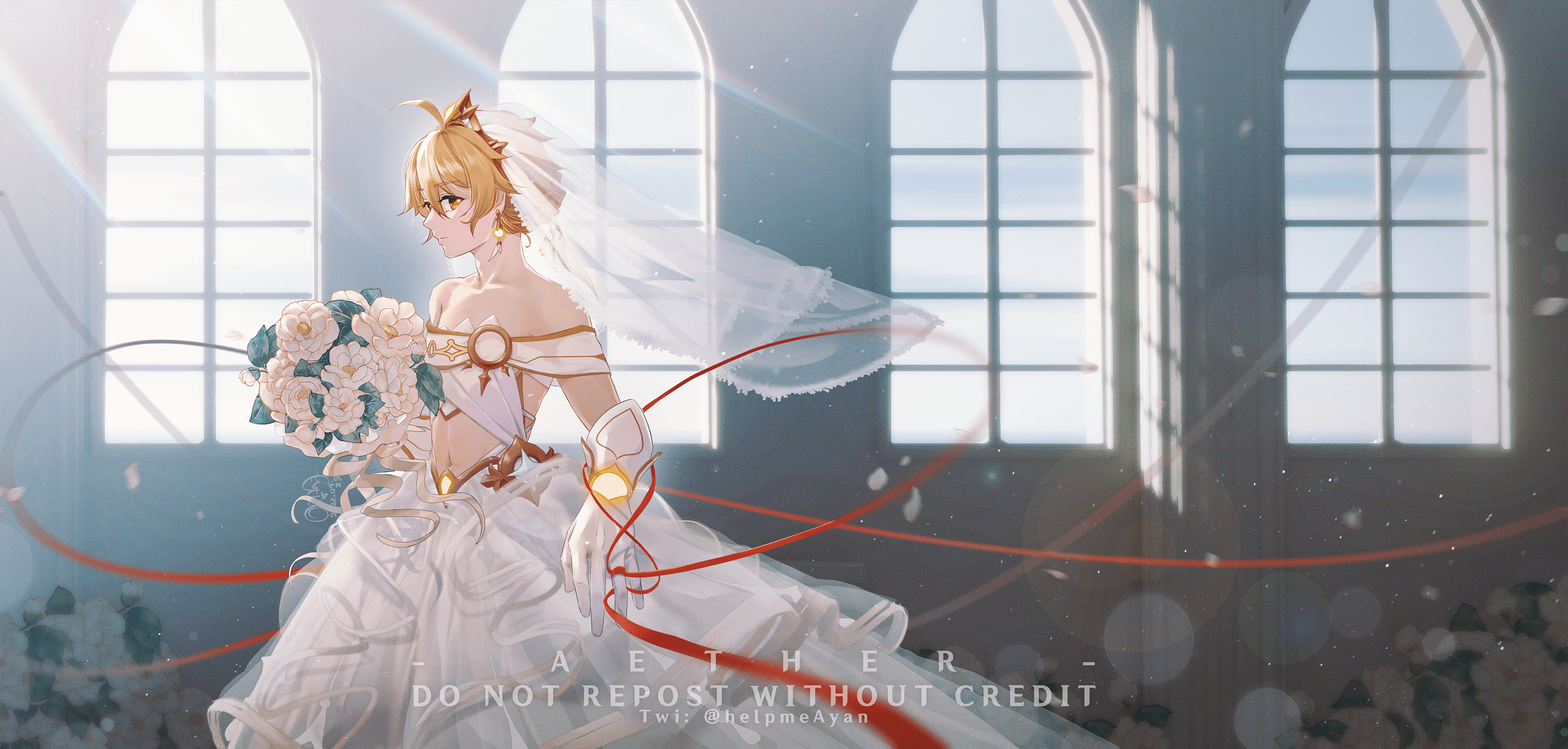 1boy aether_(genshin_impact) ahoge bare_shoulders blonde_hair blush bouquet bridal_veil bride cielo_ayan crossdressing crossdressing_(mtf) dress earrings elbow_gloves flower genshin_impact gloves hair_between_eyes hair_ornament highres holding holding_bouquet jewelry long_hair looking_at_viewer male_focus rose solo strapless strapless_dress veil wedding wedding_dress white_dress white_flower white_gloves white_rose yellow_eyes