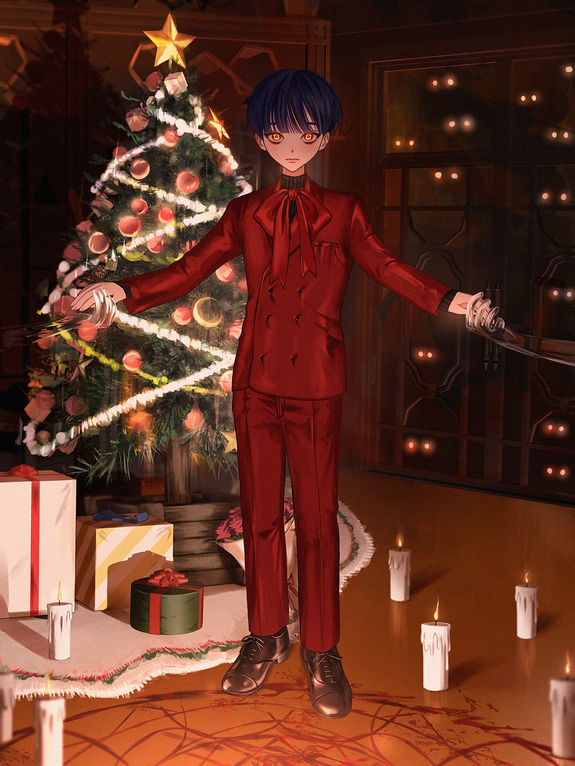 1boy absurdres black_shoes blood blue_hair bow bowtie box buttons candle christmas christmas_ornaments christmas_tree closed_eyes disembodied_hand double-breasted floor formal_clothes gift gift_box glowing glowing_eyes highres indoors jacket magic_circle male_focus original pants red_bow red_bowtie red_jacket red_pants red_suit riroi_(rntr_ll) shadow shoes short_hair solo standing star_(symbol) suit yellow_eyes