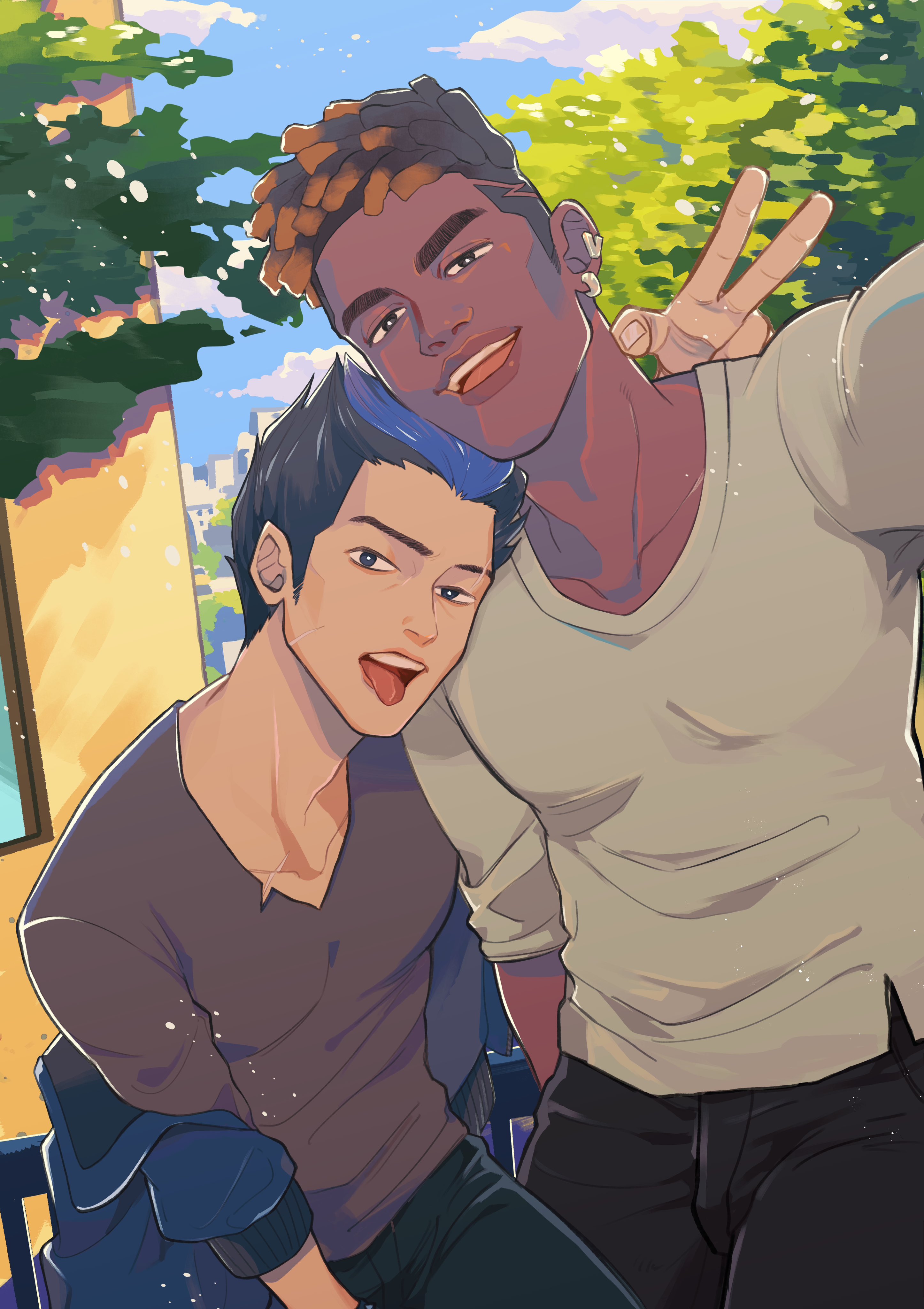 1715yorugohan 2boys absurdres arm_around_shoulder black_eyes black_hair black_pants black_shirt blue_hair blue_jacket brown_hair building cityscape cloud collarbone commentary crew_neck dark-skinned_male dark_skin dreadlocks english_commentary head_on_another's_shoulder highres jacket jacket_partially_removed looking_at_viewer male_focus multicolored_hair multiple_boys outstretched_arm pants phoenix_(valorant) railing shirt short_hair sitting sky t-shirt teeth thick_eyebrows tongue tongue_out tree upper_teeth_only v v-neck valorant white_shirt yoru_(valorant)