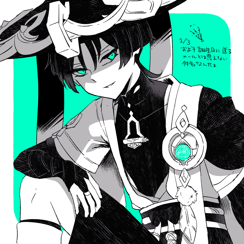 1boy aqua_background aqua_eyes aqua_gem arm_at_side arm_on_knee armor belt blunt_ends bodysuit border bow bridal_gauntlets cape character_print covered_collarbone feathers gem genshin_impact greyscale han'eri hand_on_own_thigh hat japanese_armor japanese_clothes jingasa kimono knee_up kote layered_kimono layered_sleeves looking_at_viewer male_focus mandarin_collar monochrome nahida_(genshin_impact) open_clothes open_kimono pom_pom_(clothes) poteto_1221 rope sash scaramouche_(genshin_impact) shaded_face short_sleeves shorts shoulder_peek sketch smile solo spot_color translation_request tsurime vision_(genshin_impact) wanderer_(genshin_impact) white_border