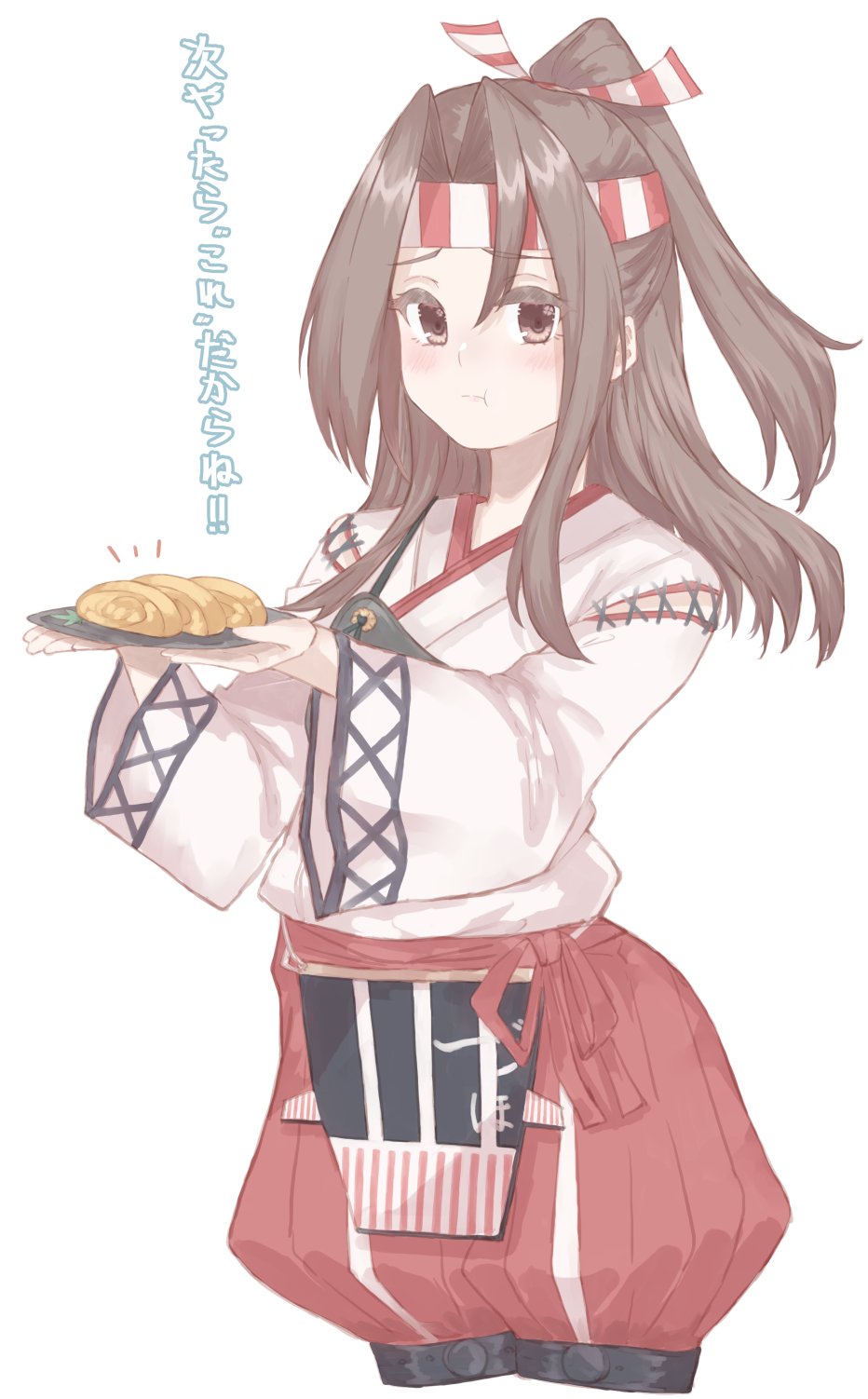 1girl apron azumaya_toride brown_eyes brown_hair commentary_request cowboy_shot food hachimaki hakama hakama_shorts headband high_ponytail highres japanese_clothes kantai_collection kosode long_hair looking_at_viewer muneate omelet ponytail shorts simple_background solo striped_headband tamagoyaki translation_request white_background zuihou_(kancolle)