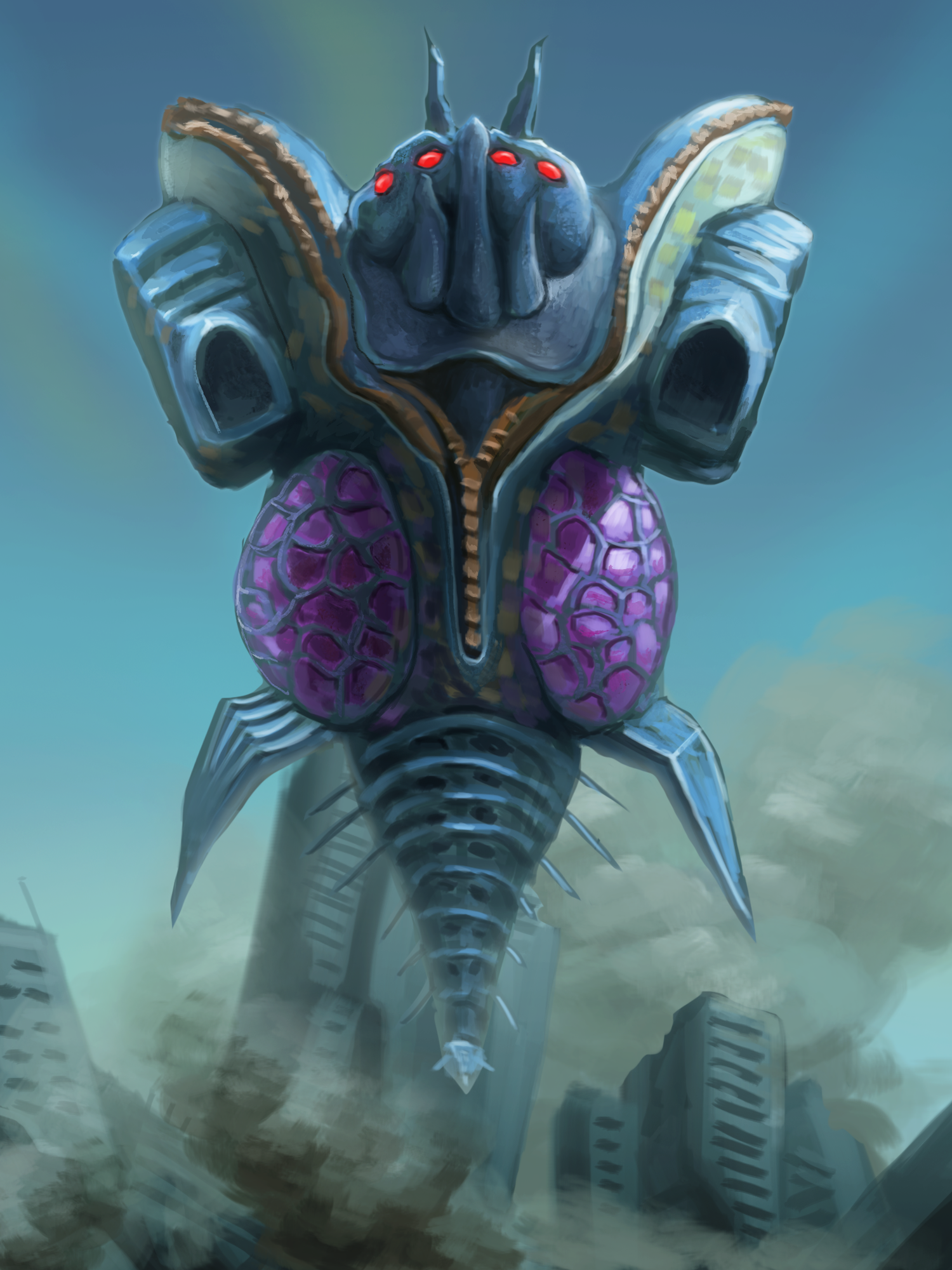 blue_skin building city colored_skin commentary_request day floating highres kaiju kudaya0825 mega_flash midair monster nautilus_(animal) outdoors red_eyes rubble smoke tokusatsu ultra_series ultraman_nexus_(series)