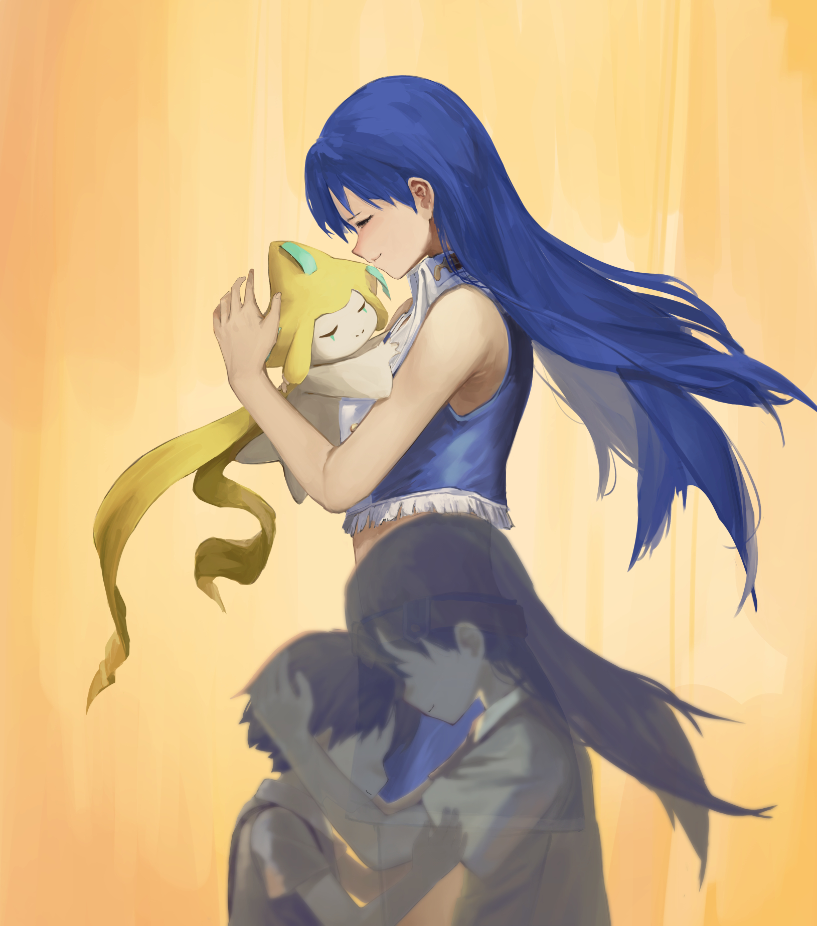 1boy 1girl aged_down bare_shoulders belt blue_hair blue_skirt brother_and_sister brown_eyes closed_eyes collared_shirt colored_skin commentary_request cropped_shirt floating_hair from_side gen_3_pokemon hands_on_another's_head heads_together highres idolmaster idolmaster_(classic) issun_boushi_(taku37taku) jirachi kisaragi_chihaya kisaragi_yuu_(idolmaster) legendary_pokemon long_hair luxury_(idolmaster) mythical_pokemon nintendo no_eyes pokemon pokemon_(creature) shirt short_hair siblings skirt sleeveless sleeveless_shirt smile standing white_skin