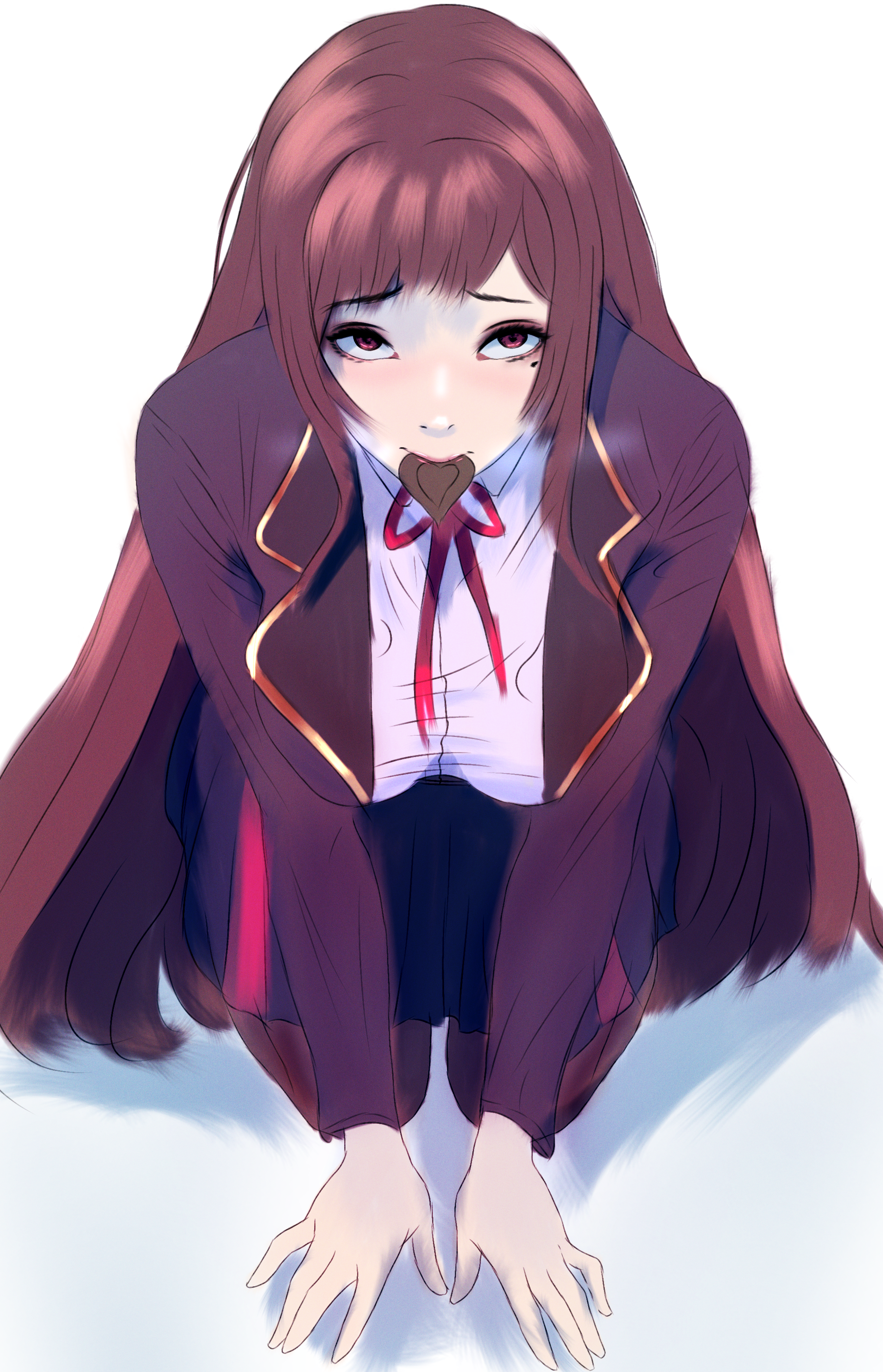 1girl absurdres banmin banmin_chan breasts brown_hair chocolate_in_mouth colored_skin eyeshadow eyeshadow_under_eye highres hime_cut large_breasts lipstick lolita_fashion long_hair makeup military_lolita mole mountainbro red_eyes thick_thighs thighs valentines_chocolate virtual_youtuber white_skin