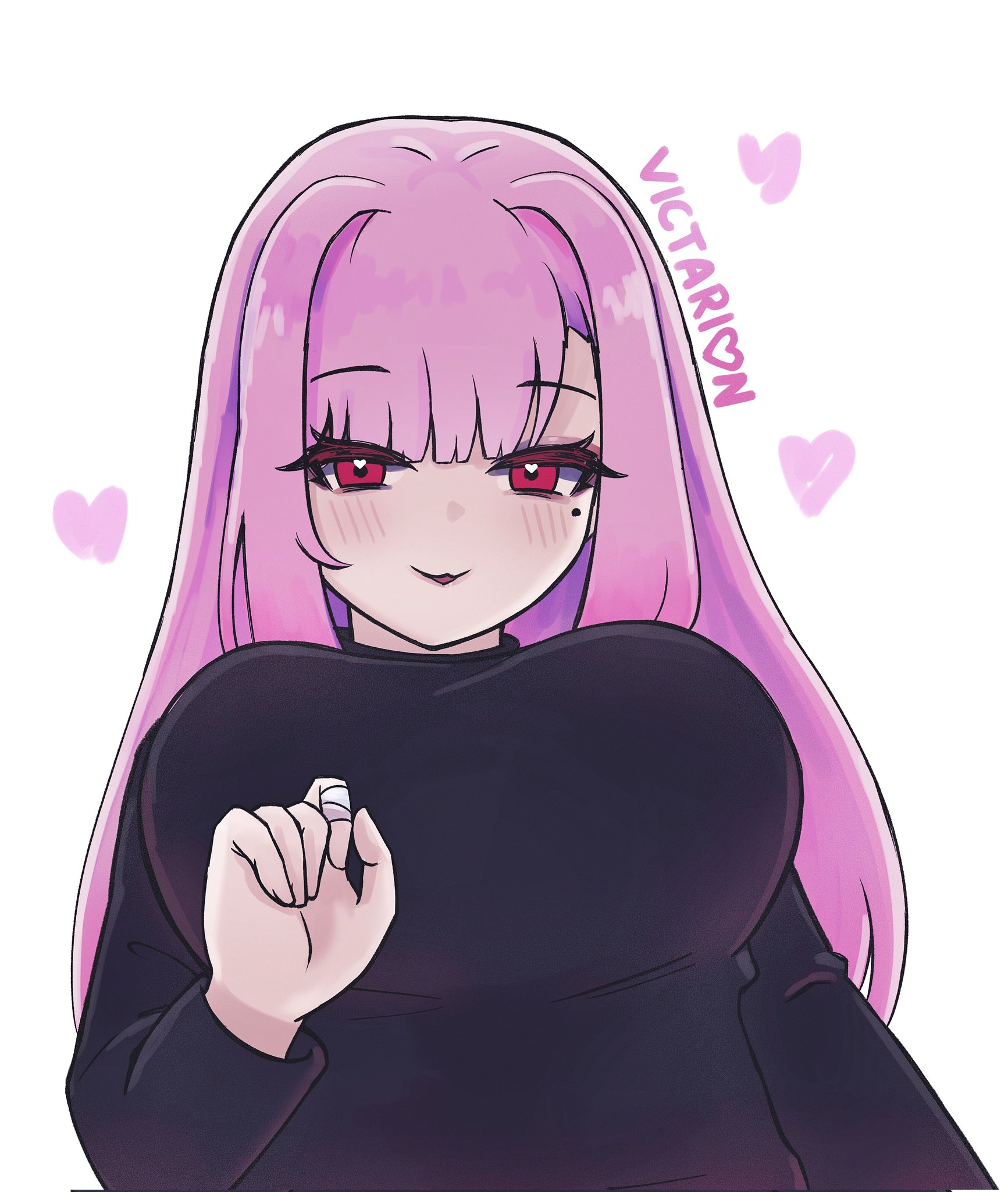 1girl bandage_on_finger banmin banmin_chan breasts colored_skin eyeshadow eyeshadow_under_eye highres hime_cut large_breasts lipstick long_hair makeup mole pink_hair pinkmin red_eyes thick_thighs thighs valentines_chocolate valetines victarionsc virtual_youtuber white_skin