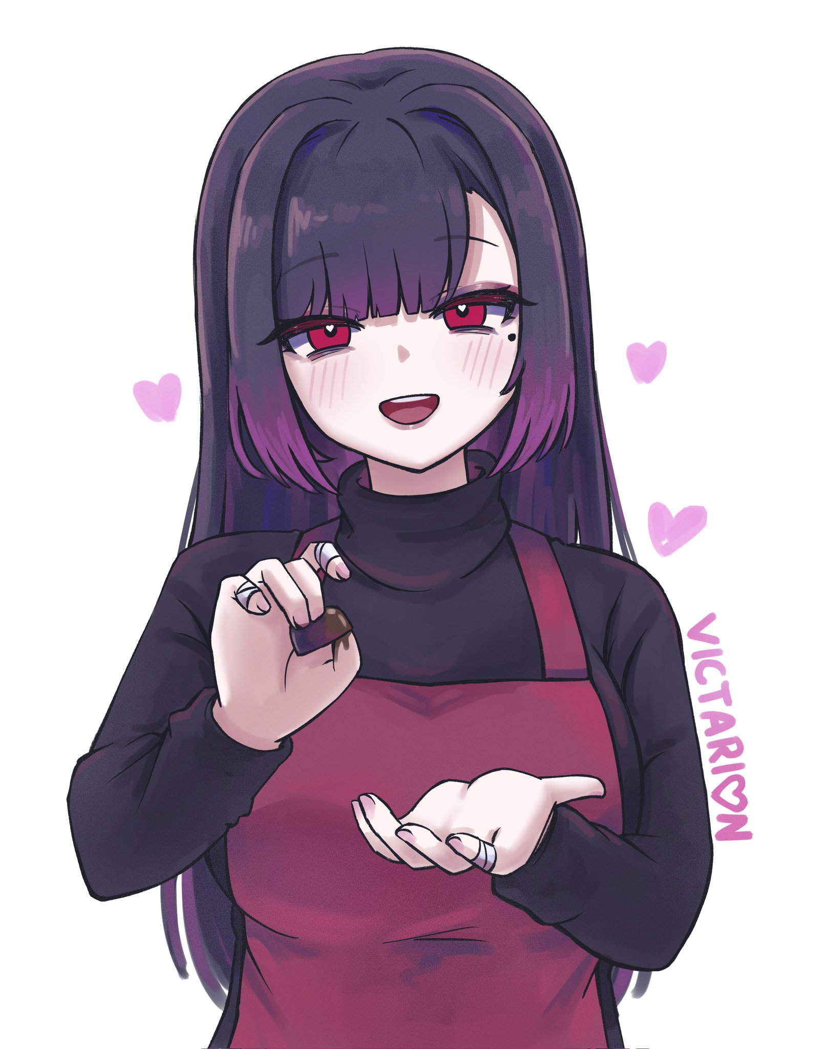 1girl bandage_on_finger banmin banmin_chan black_hair breasts colored_skin eyeshadow eyeshadow_under_eye highres hime_cut large_breasts lipstick long_hair makeup mole red_eyes thick_thighs thighs valentines_chocolate valetines victarionsc virtual_youtuber white_skin