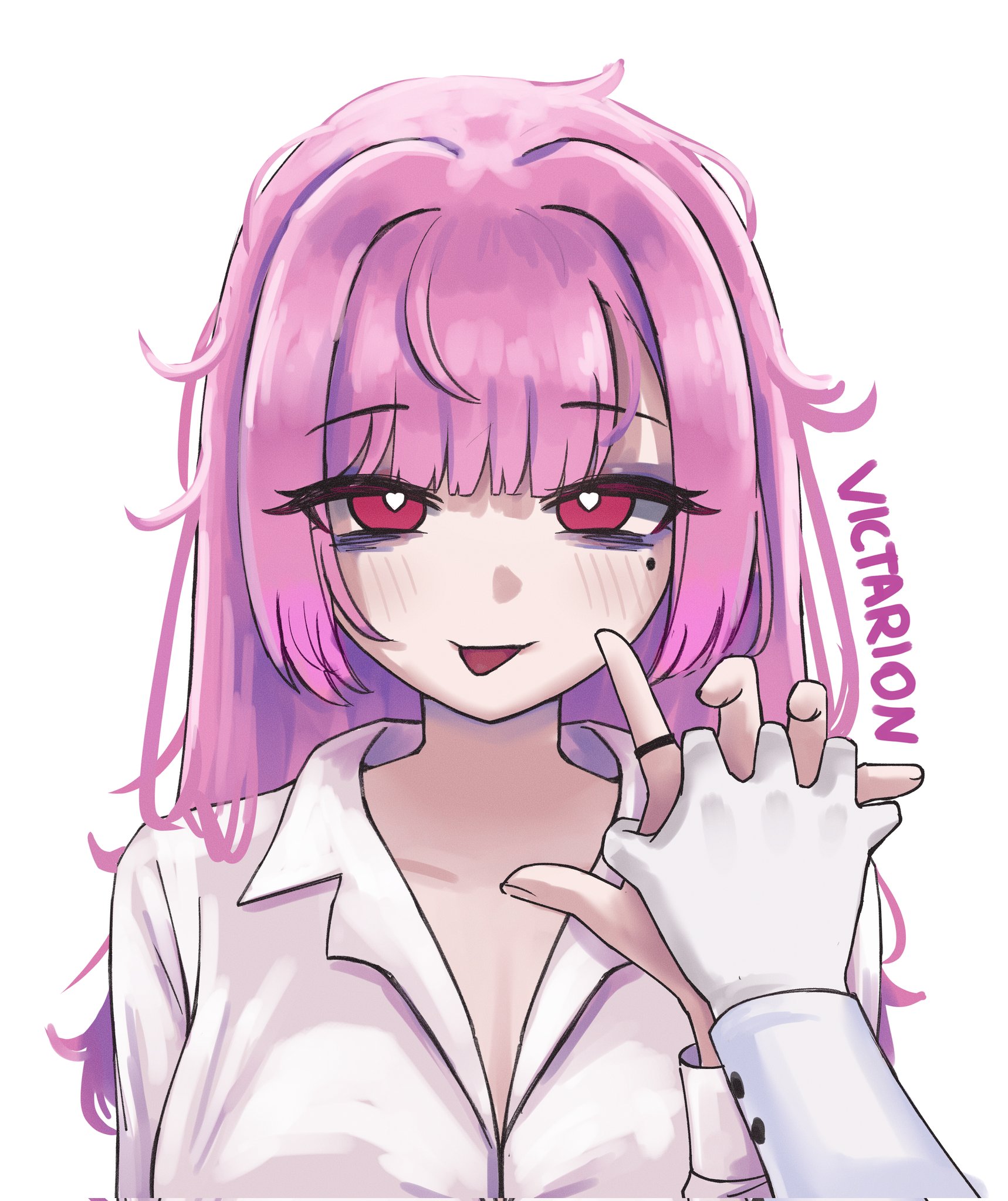 1girl banmin banmin_chan breasts colored_skin eyeshadow eyeshadow_under_eye highres hime_cut holding_hands large_breasts lipstick lolita_fashion long_hair makeup military_lolita mole pink_hair pinkmin red_eyes shirt thick_thighs thighs undressing victarionsc virtual_youtuber white_shirt white_skin
