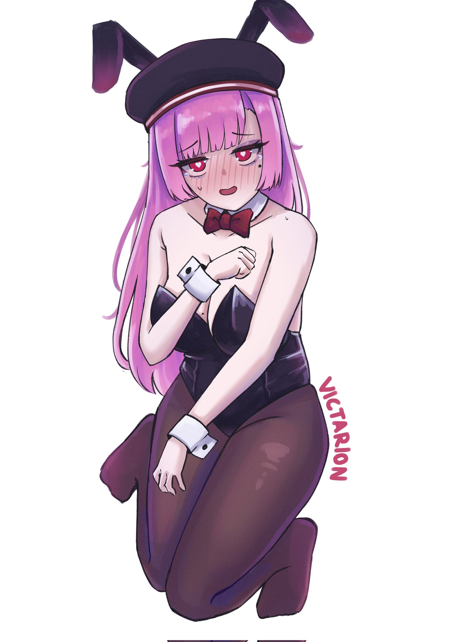 1girl banmin banmin_chan breasts colored_skin embarrassed eyeshadow eyeshadow_under_eye highres hime_cut large_breasts lipstick lolita_fashion long_hair makeup military_lolita mole original pink_hair playboy_bunny red_eyes thick_thighs thighs victarionsc virtual_youtuber white_skin