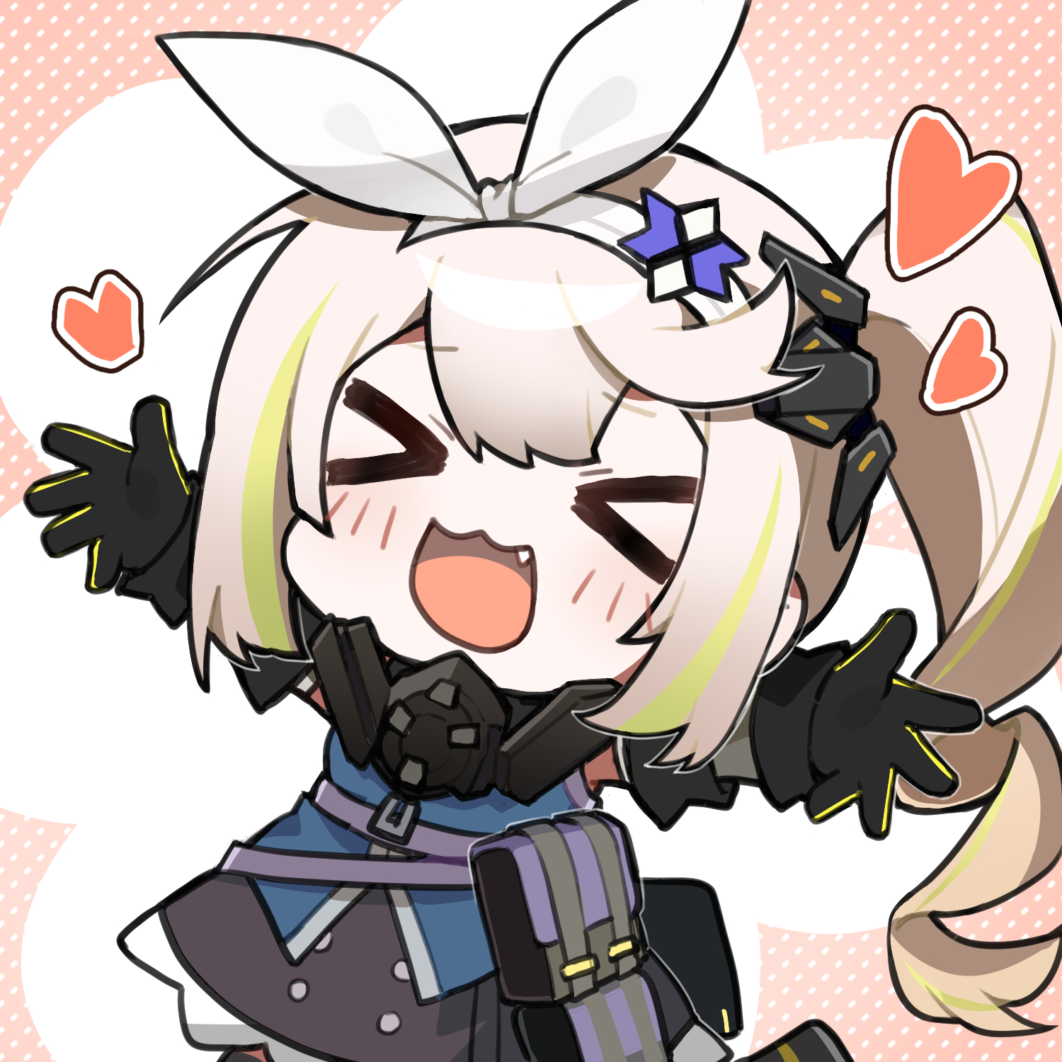 >_< 1girl :3 black_gloves blonde_hair blue_dress chibi dress fang girls'_frontline girls'_frontline_2:_exilium gloves green_hair hair_ribbon hands_up heart highres incoming_hug madcore mask multicolored_hair official_art open_mouth ribbon second-party_source sharkry_(girls'_frontline_2) side_ponytail solo streaked_hair unworn_mask