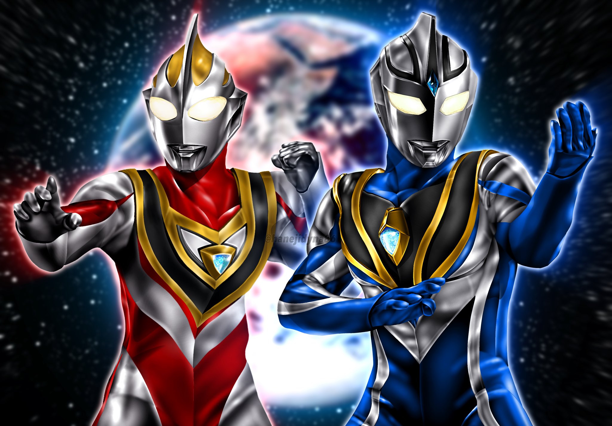 2boys alien armor blue_gem blue_skin blurry blurry_background breastplate clenched_hand collarbone color_timer colored_skin commentary compound_eyes dorsal_fin earth_(planet) fighting_stance forehead_jewel gem glowing glowing_eyes gold_trim hands_up hanejidyna86 highres looking_ahead male_focus multicolored_skin multiple_boys muscular muscular_male open_hands outstretched_arm pectorals planet red_skin side-by-side silver_skin space standing star_(sky) starry_sky_background tokusatsu twitter_username ultra_series ultraman_agul ultraman_agul_(v2) ultraman_gaia ultraman_gaia_(series) ultraman_gaia_(v2) upper_body wrinkled_skin yellow_eyes