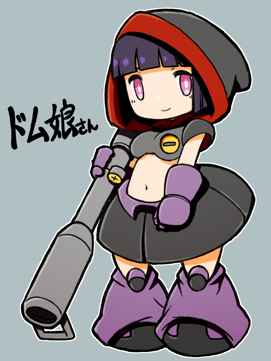 1girl bazooka_(gundam) beeru_(veil8801) black_shoes black_skirt blunt_bangs blunt_ends breasts bright_pupils character_name closed_mouth dom_(mobile_suit) full_body gloves grey_background gundam highres hood hood_up leg_warmers medium_breasts medium_skirt mobile_suit_gundam navel outline personification pink_eyes purple_gloves purple_hair purple_leg_warmers shoes short_hair simple_background skirt smile solo standing white_outline white_pupils