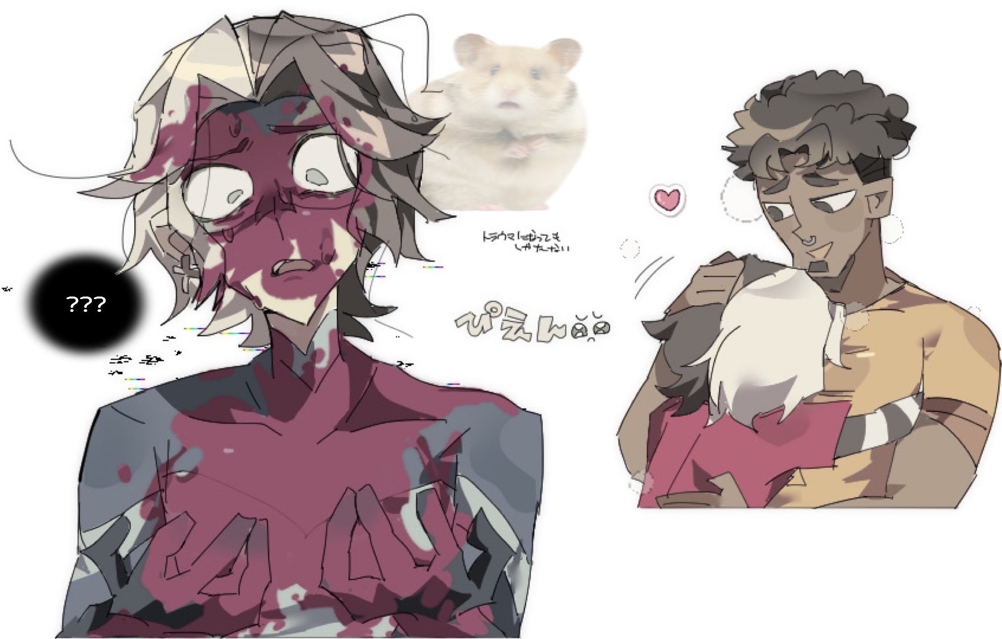 2boys afro aiden_(disventure_camp) black_hair blood blood_on_face blood_on_hands commentary_request disventure_camp dokusuji_(kw9onou58) face_piercing heart highres hug james_(disventure_camp) layered_shirt layered_sleeves long_sleeves male_focus multicolored_hair multiple_boys mutual_hug nose_piercing open_mouth piercing red_shirt shirt short_over_long_sleeves short_sleeves smile split-color_hair striped_clothes striped_shirt translation_request two-tone_hair white_hair yellow_shirt