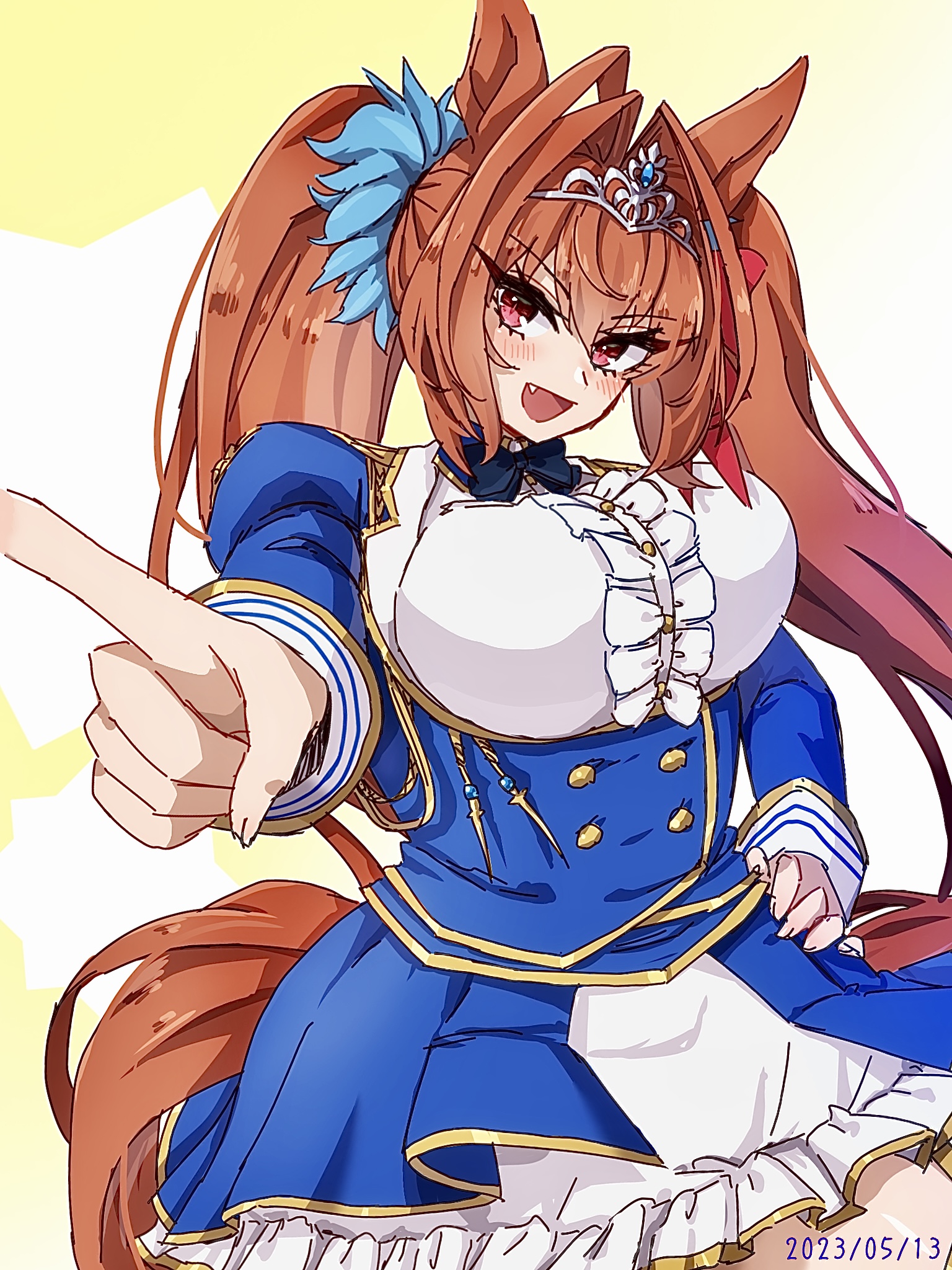 1girl animal_ears arm_up black_bow black_bowtie blue_gem blue_jacket blue_skirt bow bowtie breasts brown_hair buttons commentary_request cowboy_shot daiwa_scarlet_(umamusume) frills gem hair_between_eyes hair_ornament hand_on_own_hip hide_oo highres horse_ears horse_girl index_finger_raised jacket juliet_sleeves large_breasts long_hair long_sleeves looking_at_viewer open_clothes open_jacket pink_ribbon puffy_sleeves red_eyes ribbon sidelocks skirt solo standing tiara twintails two-tone_background umamusume white_background white_hair yellow_background