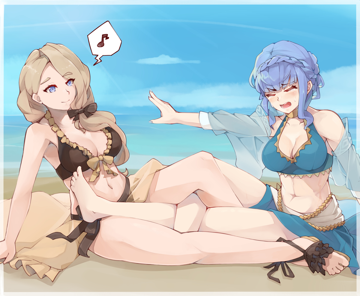 2girls beach catfight figure_four_leglock fire_emblem fire_emblem:_three_houses fire_emblem_heroes jaegan marianne_von_edmund mercedes_von_martritz multiple_girls nintendo submission_hold swimsuit tagme wrestling