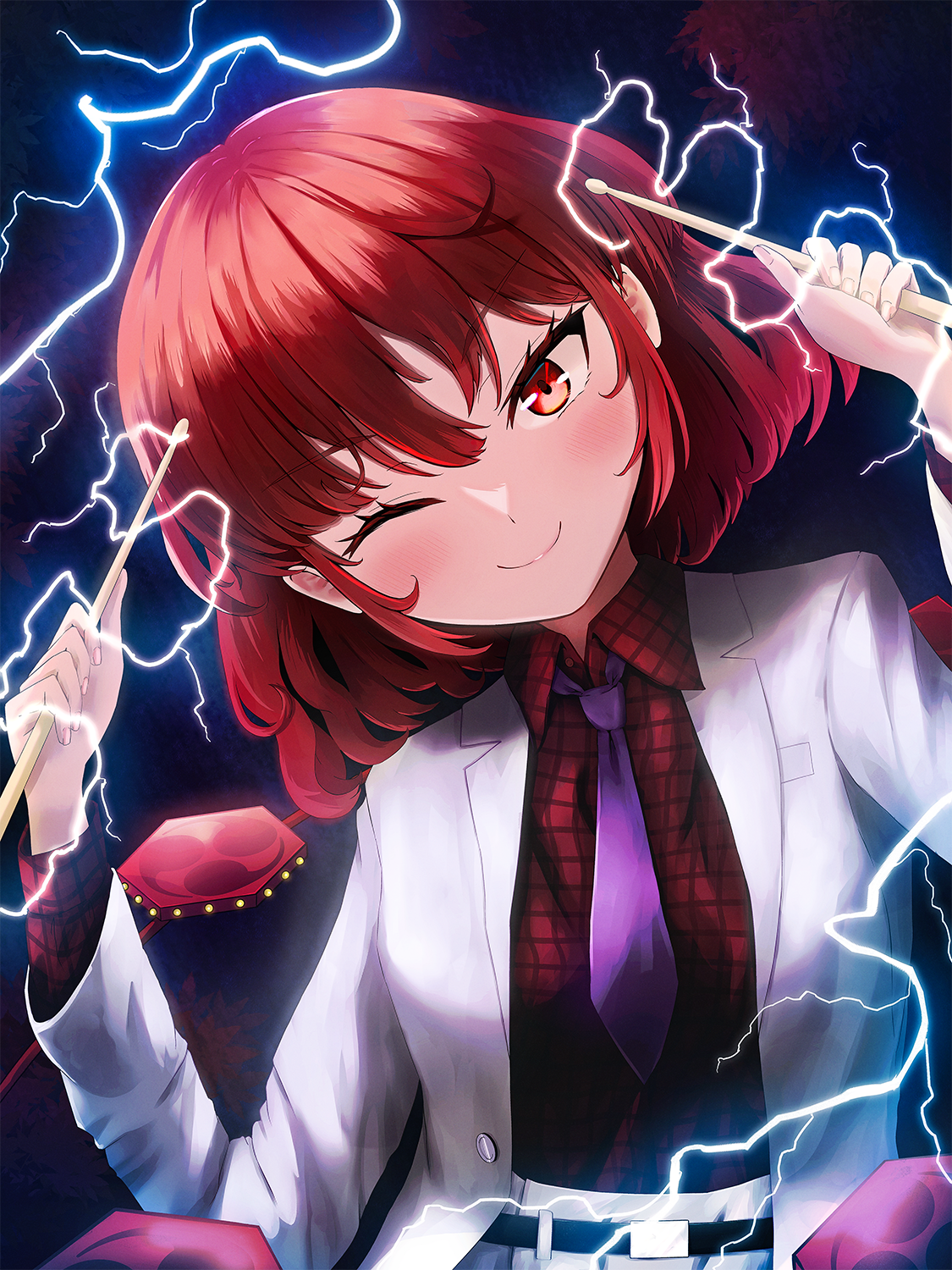 1girl ;) belt black_background blush closed_mouth commentary_request drumsticks highres holding holding_drumsticks horikawa_raiko lightning long_sleeves looking_at_viewer necktie one_eye_closed plaid_clothes plaid_shirt purple_necktie red_eyes red_hair red_shirt shirt short_hair smile solo touhou upper_body yoirone