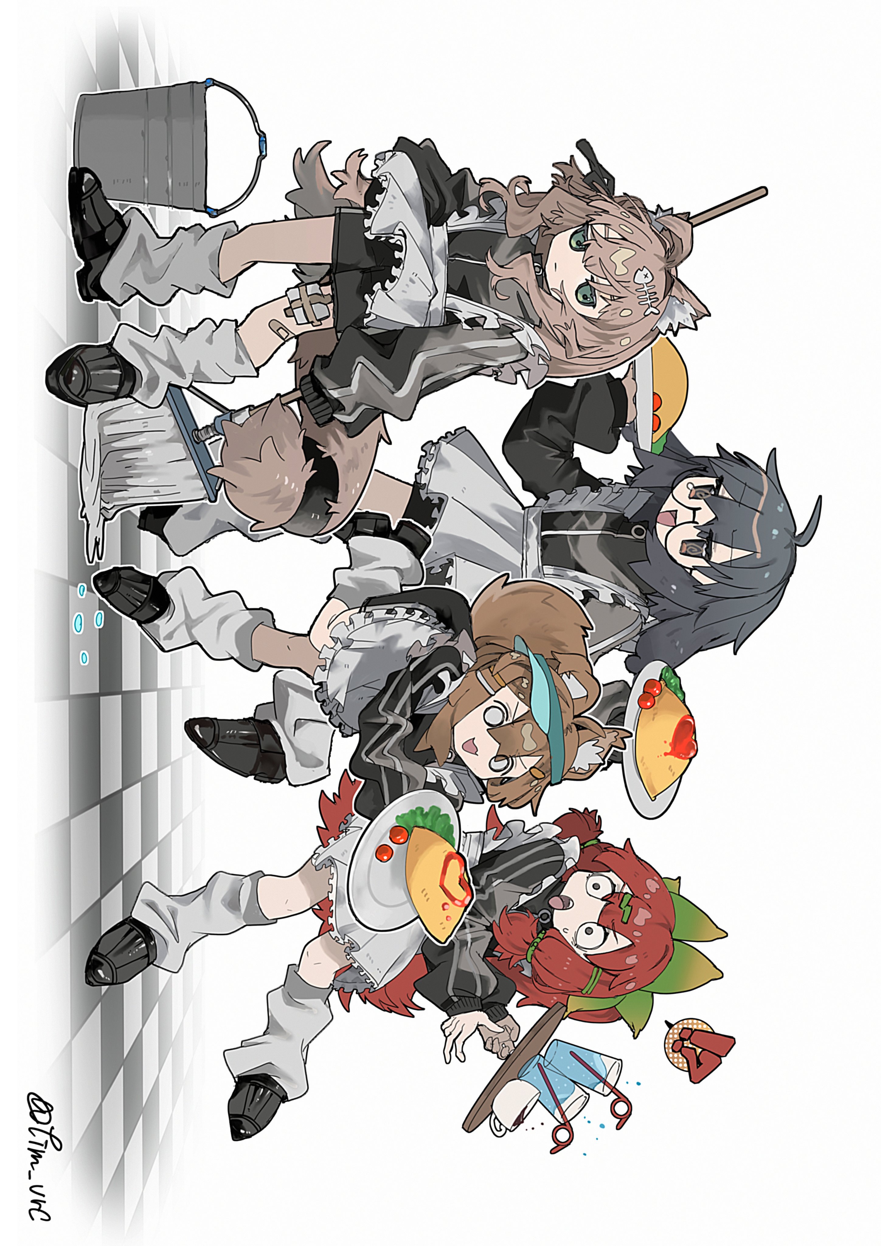 4girls :< :3 :d :o @_@ absurdres ahoge animal_ear_fluff animal_ears antenna_hair apron artist_name bandaged_leg bandages bandaid bandaid_on_cheek bandaid_on_face bandaid_on_head bandaid_on_knee bandaid_on_leg bandaid_on_nose bent_over bike_shorts black_bow black_dress black_eyes black_hair black_jacket black_ribbon black_shirt black_shoes black_shorts black_skirt blush bone_hair_ornament bottle bow braid broom brown_eyes brown_hair bucket cat_ears checkered_floor cleaning closed_mouth crab crossed_bandaids cup dress dropping fang fish_hair_ornament flower food food_art frilled_apron frills fruit full_body gauze glasses green_bow green_eyes grey_eyes grey_hair hair_between_eyes hair_bow hair_bun hair_flower hair_ornament hair_ribbon hairband hairclip highres holding holding_broom holding_bucket holding_food holding_mop holding_plate holding_tray jacket jitome ketchup kipfel_(vrchat) kneehighs ladder leaning_forward leaning_to_the_side leg_warmers loafers long_hair long_sleeves looking_at_viewer loose_socks maid maid_apron maid_day maid_headdress mamehinata medium_hair messy_hair miniskirt mop multiple_girls o_o object_on_head omelet omurice open_mouth partially_unzipped plate puffy_sleeves red-framed_eyewear red_hair ribbon round_eyewear semi-rimless_eyewear shadow shirt shoes short_hair shorts shorts_under_skirt sidelocks sideways signature simple_background skin_fang skirt sleeves_past_fingers sleeves_past_wrists smile socks spill squirrel_ears squirrel_girl squirrel_tail standing stick striped_clothes sweatdrop tail teeth thigh_strap tile_floor tiles timc_vrc track_jacket tray tripping twintails twitter_username unconventional_maid under-rim_eyewear usasaki_(vrchat) v-shaped_eyebrows visor_cap vrchat waist_apron waitress watermark wavy_hair weibo_watermark white_apron white_background white_socks x_hair_ornament zipper zipper_pull_tab