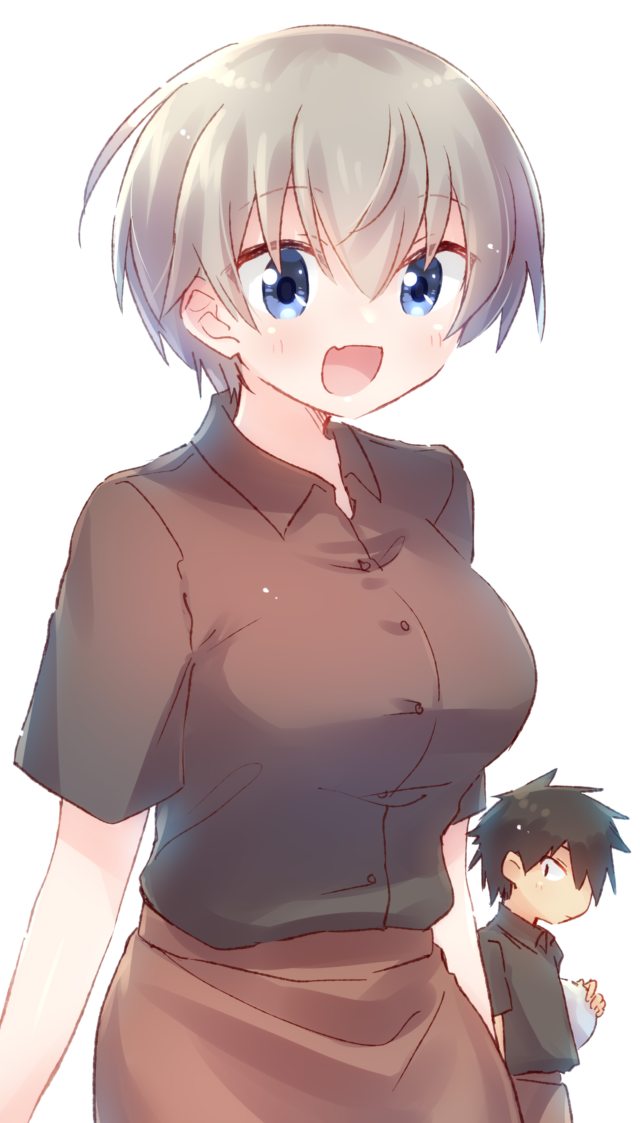 1boy 1girl absurdres apron black_hair blue_eyes breasts brown_apron collared_shirt commentary_request cowboy_shot employee_uniform fang grey_hair hair_between_eyes highres large_breasts looking_at_another looking_at_viewer nyaa_(nnekoron) open_mouth sakurai_shin'ichi shirt short_hair simple_background skin_fang smile solo_focus standing uzaki-chan_wa_asobitai! uzaki_hana waist_apron white_background
