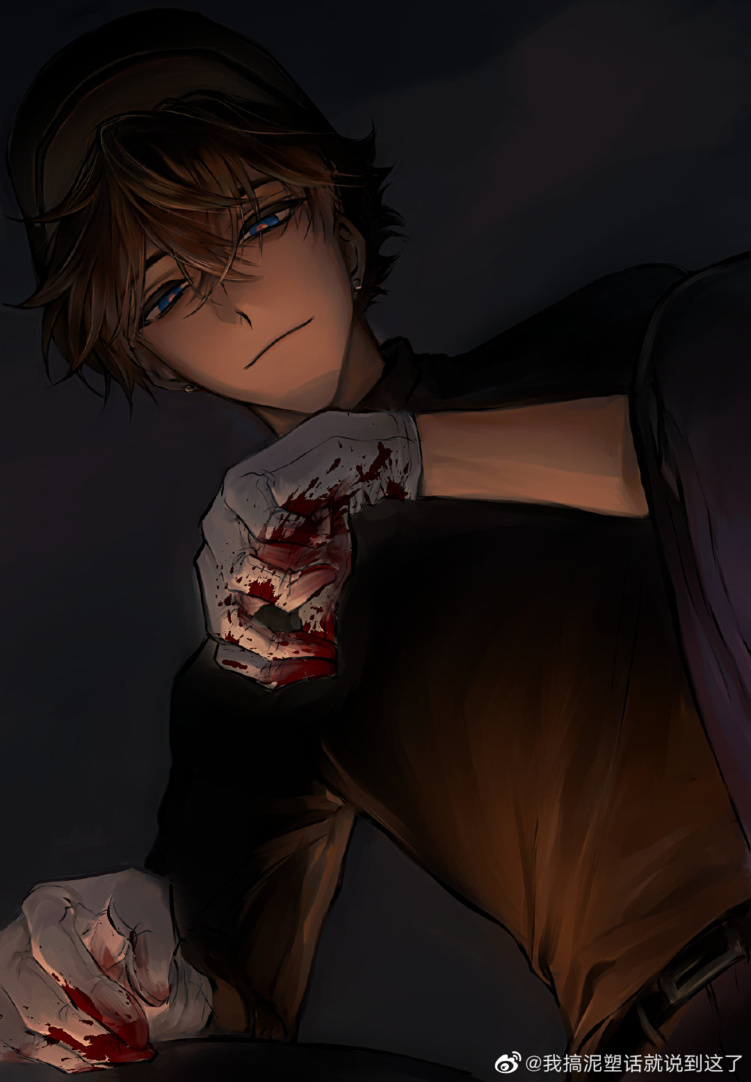 1boy belt black_background black_belt black_hair black_hat black_shirt blood blood_on_clothes blood_on_face blood_on_hands blue_eyes closed_mouth earrings from_below gloves grey_background hair_between_eyes haoriday hat highres holding jewelry kuroba_kaito long_sleeves looking_at_viewer looking_down magic_kaito male_focus pants shirt short_hair simple_background single_earring sitting smile solo turtleneck watermark weibo_watermark white_gloves