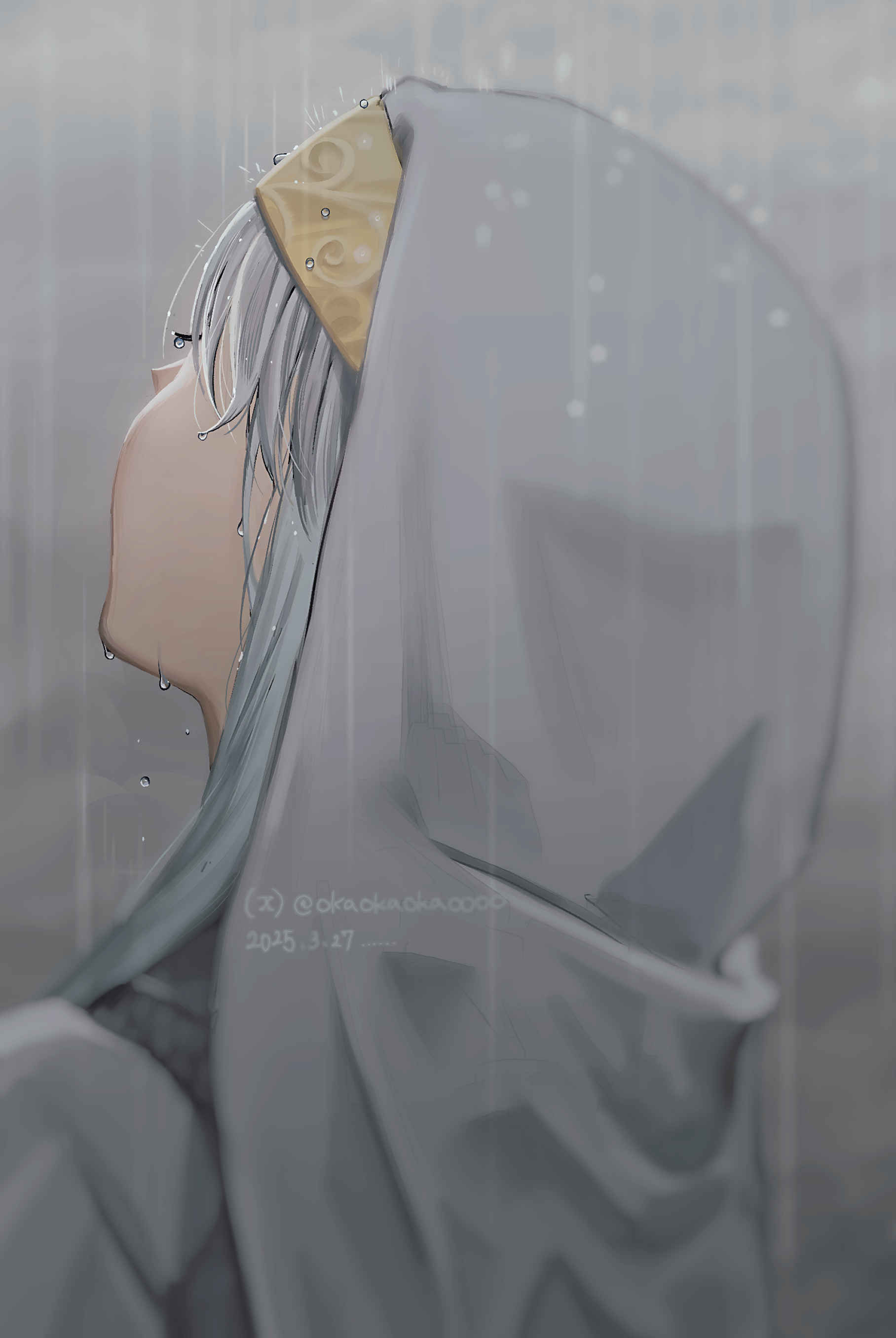 1girl absurdres dated from_side grey_hair grey_sky highres index_(toaru_majutsu_no_index) long_hair looking_up nun okaokaokaoooo rain robe sky solo toaru_majutsu_no_index toaru_majutsu_no_index:_genesis_testament traditional_nun twitter_username wimple