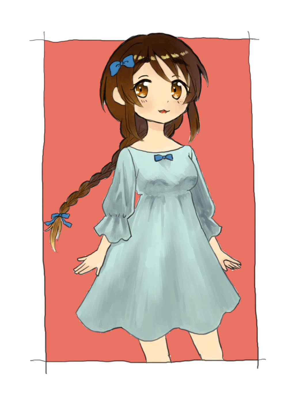 1girl aihara_yukino blue_bow blue_dress blue_ribbon blush border bow breasts brown_eyes brown_hair commentary_request dress hair_bow hair_ribbon highres idolmaster idolmaster_cinderella_girls long_braid long_hair looking_at_viewer oslumberi ribbon smile solo very_long_hair white_border