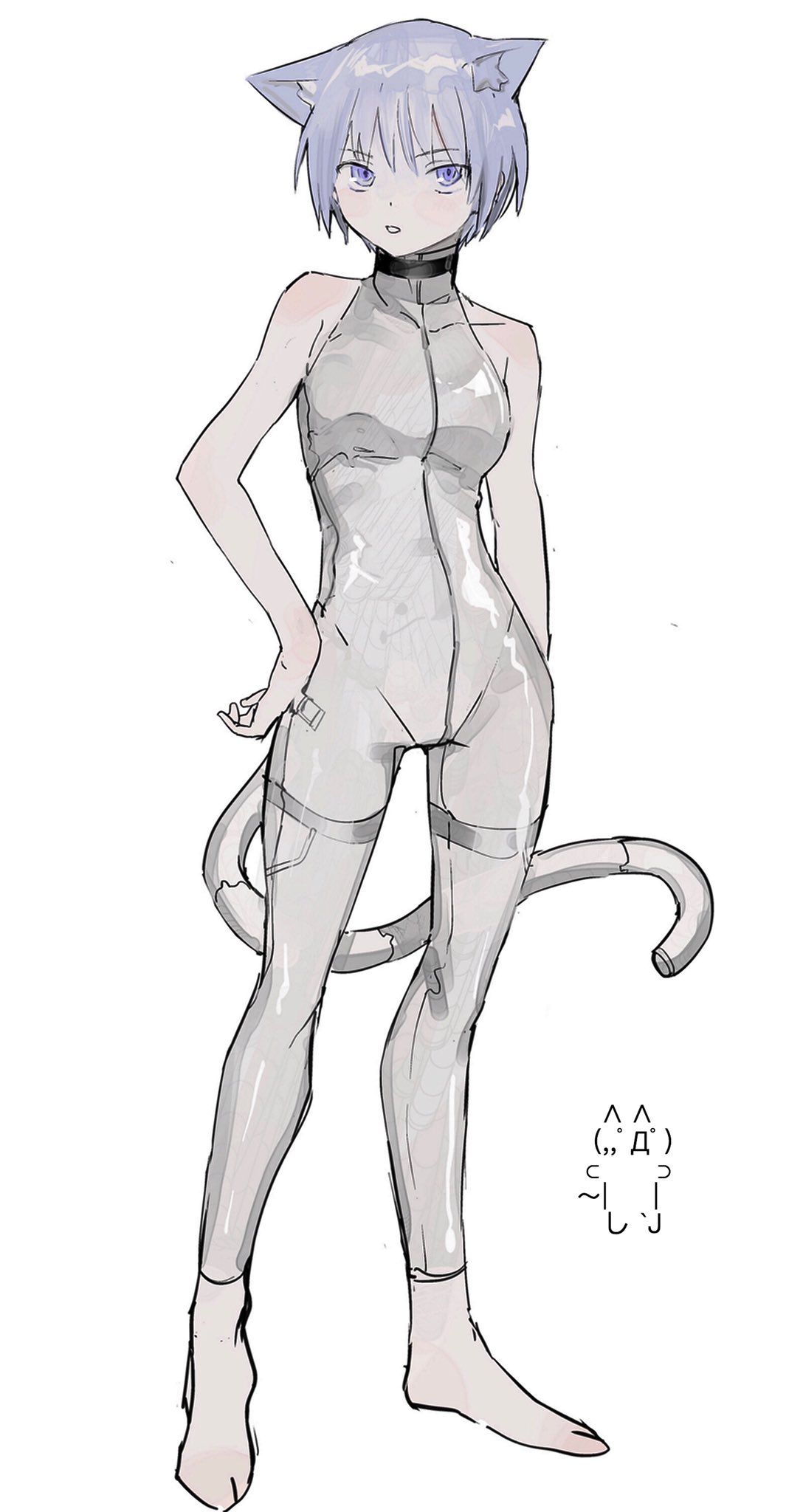 1girl animal_ears bad_id bad_twitter_id bare_shoulders bodysuit breasts cat_ears cat_girl cat_tail emoticon full_body hand_on_own_hip highres inactive_account kaomoji looking_at_viewer mechanical_tail medium_breasts original purple_eyes purple_hair short_hair simple_background solo standing suiso_(owp) tail white_background