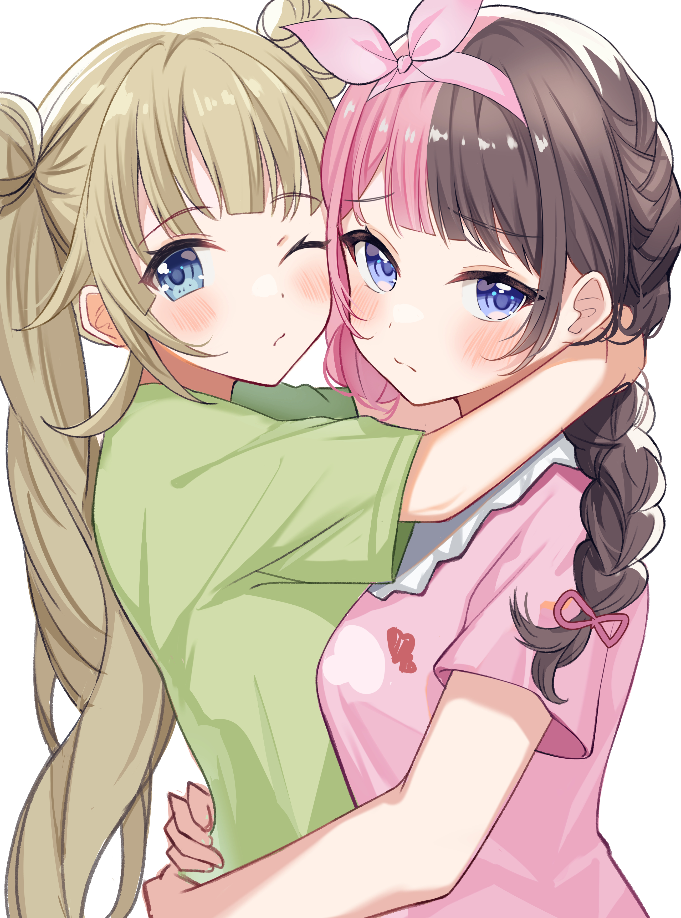2girls absurdres blue_eyes blunt_bangs blush braid brown_hair cattleya_regina_games double_bun green_hair green_shirt hair_bun hairband hanabusa_lisa highres hug iris_black_games multicolored_hair multiple_girls one_eye_closed parted_bangs pink_hair pink_shirt shirt simple_background split-color_hair t-shirt tachibana_hinano tihayasan-ktkr twin_braids twintails two-tone_hair upper_body virtual_youtuber vspo! white_background