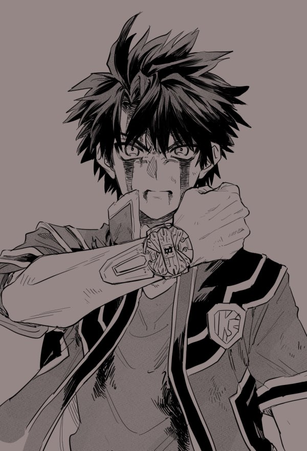 1boy asagaki_togo blood blood_on_face clenched_hand grey_background greyscale henshin_pose jacket khennnn3 male_focus monochrome open_clothes open_jacket sentai_red_isekai_de_boukensha_ni_naru shirt short_hair simple_background solo upper_body